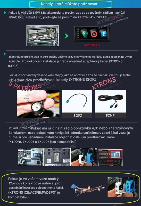 Před objednáním ověřte typ konektorů a zvukového systému ve vašem vozidle. V případě navigační jednotky v zadní části vozu může být potřeba prodlužovací kabel jako XTRONS EXL005 nebo EXL007. Doporučujeme konzultaci s profesionální instalační službou pro bezproblémovou montáž.