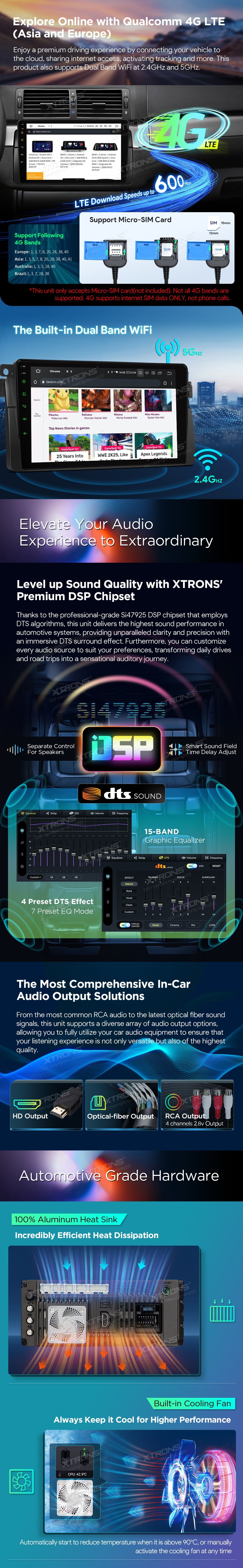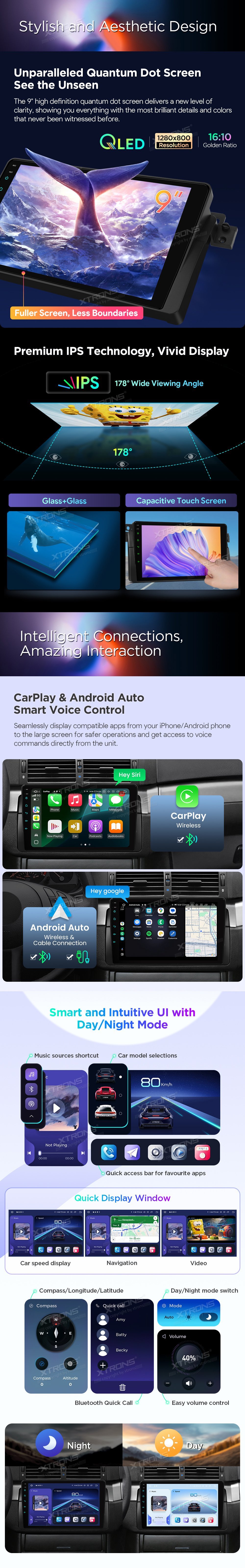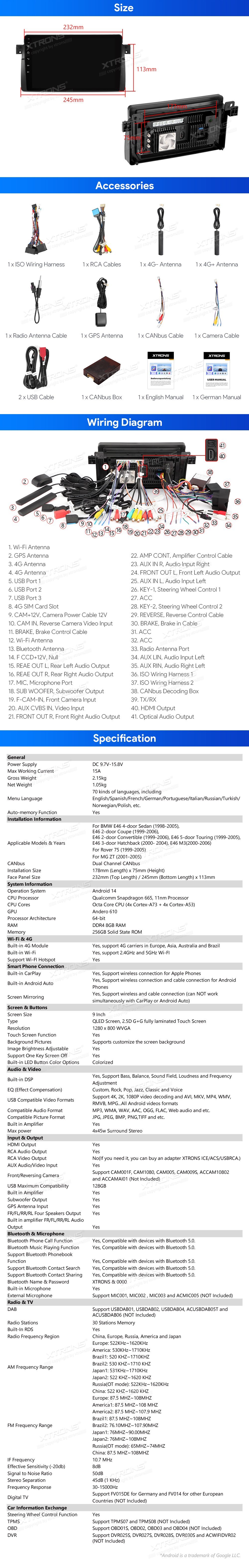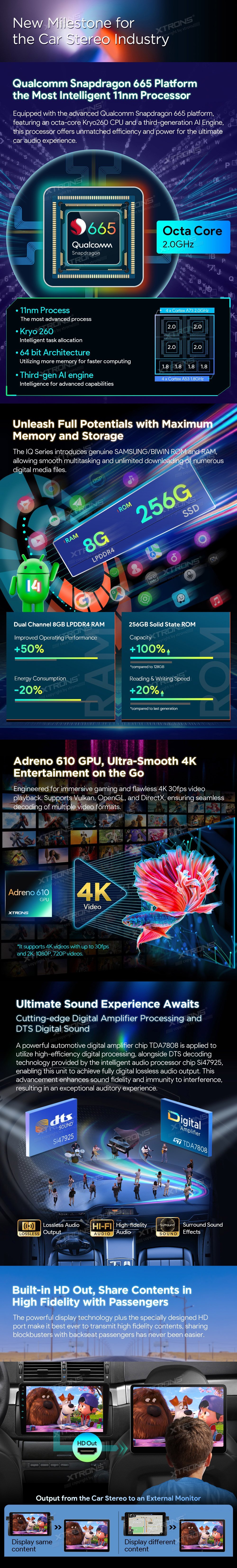 * Android 14 Octa Core Processor s 8GB RAM (DDR4), 256GB ROM (SSD) *Qualcomm Snapdragon 665 Platforma 11nm proces Až 2.0 GHZ * Špičkové zpracování digitálního zesilovače a digitální zvuk DTS -STMicroelectronics TDA7808 Zesilovač -Silicon Labs SI47925 DSP * Vestavěný výstup HDMI a optické vlákno a RCA * 9 palců 1280 * 800 rozlišení QLED IPS G + G dotyková obrazovka * Adreno 610 GPU / Podpora 4K Video * Nové uživatelské rozhraní s denním a nočním režimem * Efektivní vestavěný ventilátor s ručním řízením teploty * Built-in Bezdrátové CarPlay a bezdrátové Android Auto * Vestavěná síť 4G LTE, dopravci podpory v Asii a Evropě * Duální pásmo WiFi modul (2.4GHz a 5GHz) * Zrcadlení obrazovky * Podpora 1080P AHD kamery *Optimalizované CANbus Dekódování *Přesná GPS navigace *Poslední Bluetooth 5.0 * Multimedia USB vstup *Volitelné funkce (potřebné příslušenství) -Fotoaparát, OBD, DAB +, DVR, HD / RCA výstup, TPMS, mikrofon a klávesnice