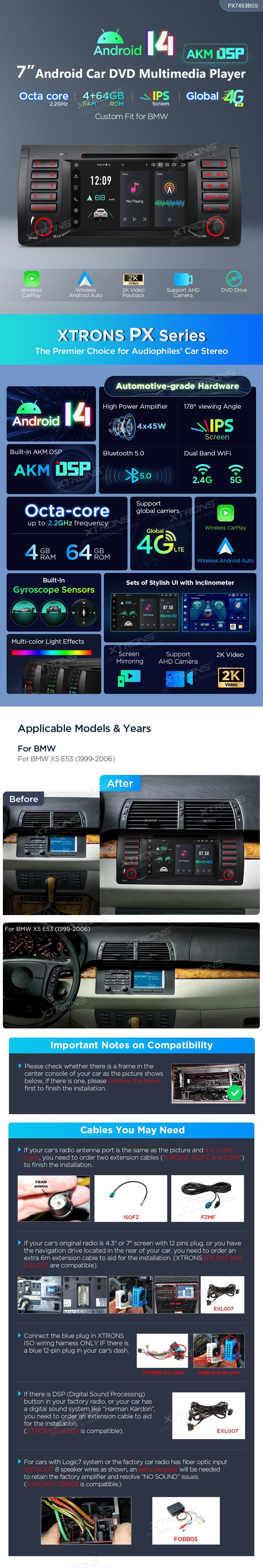 7 palců Octa Core 4+64GB Global 4G Android 14 IPS Car DVD Multimediální přehrávač vestavěný AKM DSP Gyroskopové snímače pro BMW X5 E53
