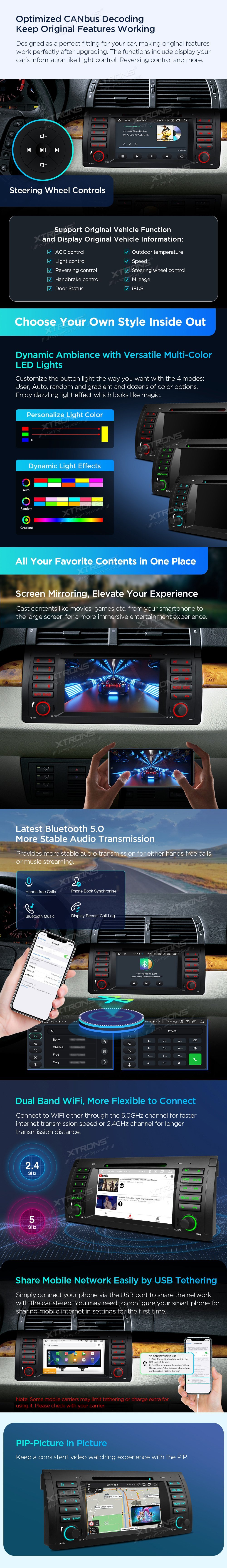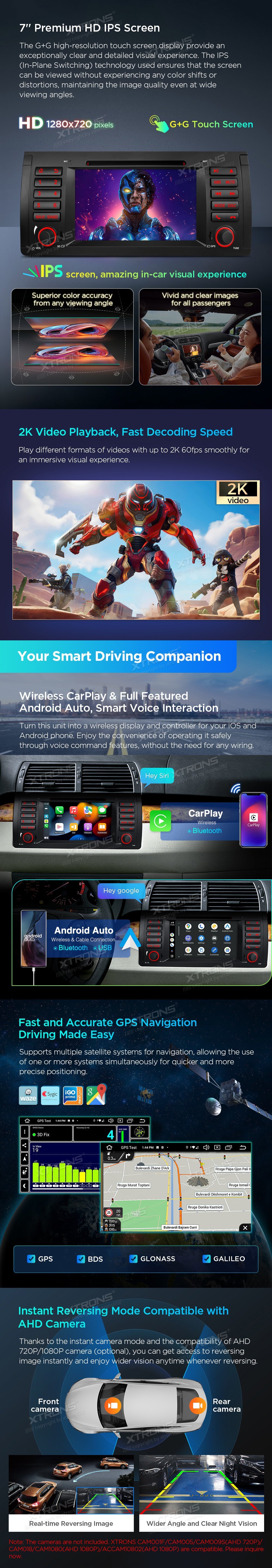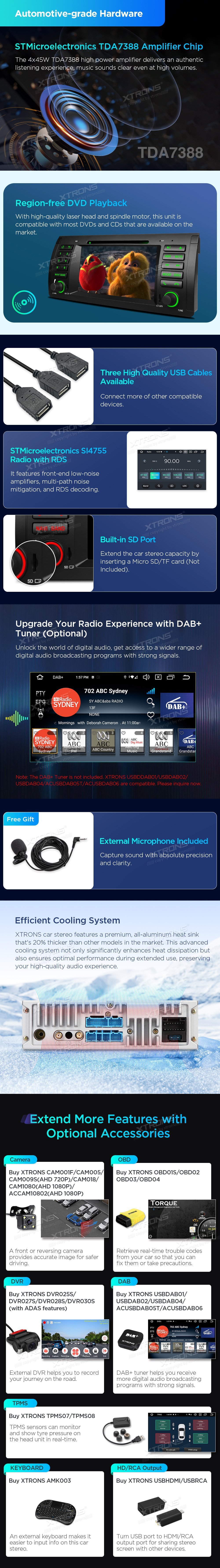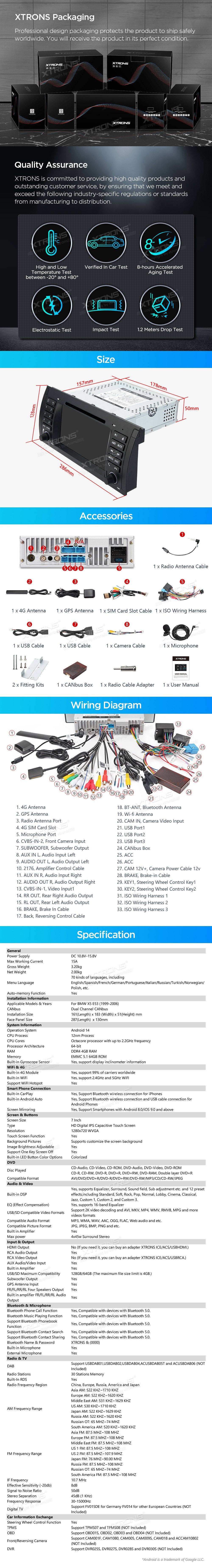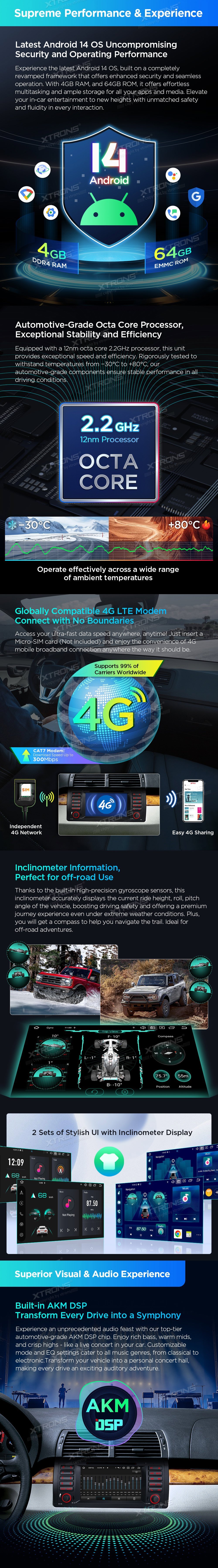 *Android 14 s 4GB DDR4 RAM+64GB EMMC ROM *12nm Octa Core 2.2GHz Procesor *Globálně Kompatibilní 4G LTE Modem Podporuje 99% Dopravců Po Celém Světě *Stok vigorsoskopy *2 Sady stylového uživatelského rozhraní s inkluzometrovým displejem *Postavitelný AKM DSP *7 palcový 1280x720 HD IPS G+G dotykový displej *2K Video Přehrávání přehrávání *Povtězené bezdrátové přehrávání automobilů a bezdrátový a USB kabel Android Auto *Rychle a přesné GPS navigace *Instanc Reversing Mode Kompatibilní s AHD kamerou *Optimizovaná podpora Canbus dekódování původní funkce vozidla a informace *Dynamická cirkulace s univerzálními vícebarevnými LED světly *Screen zrcadlení *Nejnovější Bluetooth 5.0 *Dual Band WiFi modul (2.4GHz & 5GHz) *Sdílení Mobilní Sítě Přes USB Tethering *PIP-Obrázek v obraze *Automobil-grade hardware -STMicroelectronics 4x45W TDA7388 Zesilovačový čip - Bezregionů DVD Přehrávání přehrávání -Puzený 3 USB vstup -STMicroelectronics SI4755 Radio s RDS *Externí Mikrofon Včetně *Stavebový SIM port a SD Port *Efektivní chladicí systém *Prozkoumejte více funkcí s příslušenstvím XTRONS (volitelné) -DVR, Fotoaparát, OBD, TPMS , DAB, Kejkový a HD/RCA Výstup
