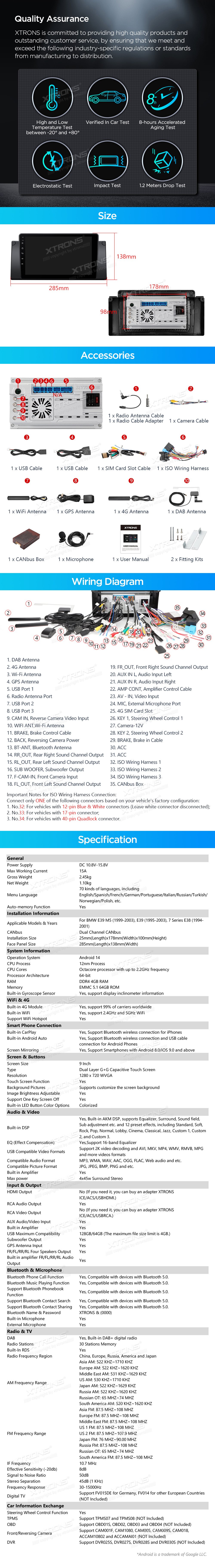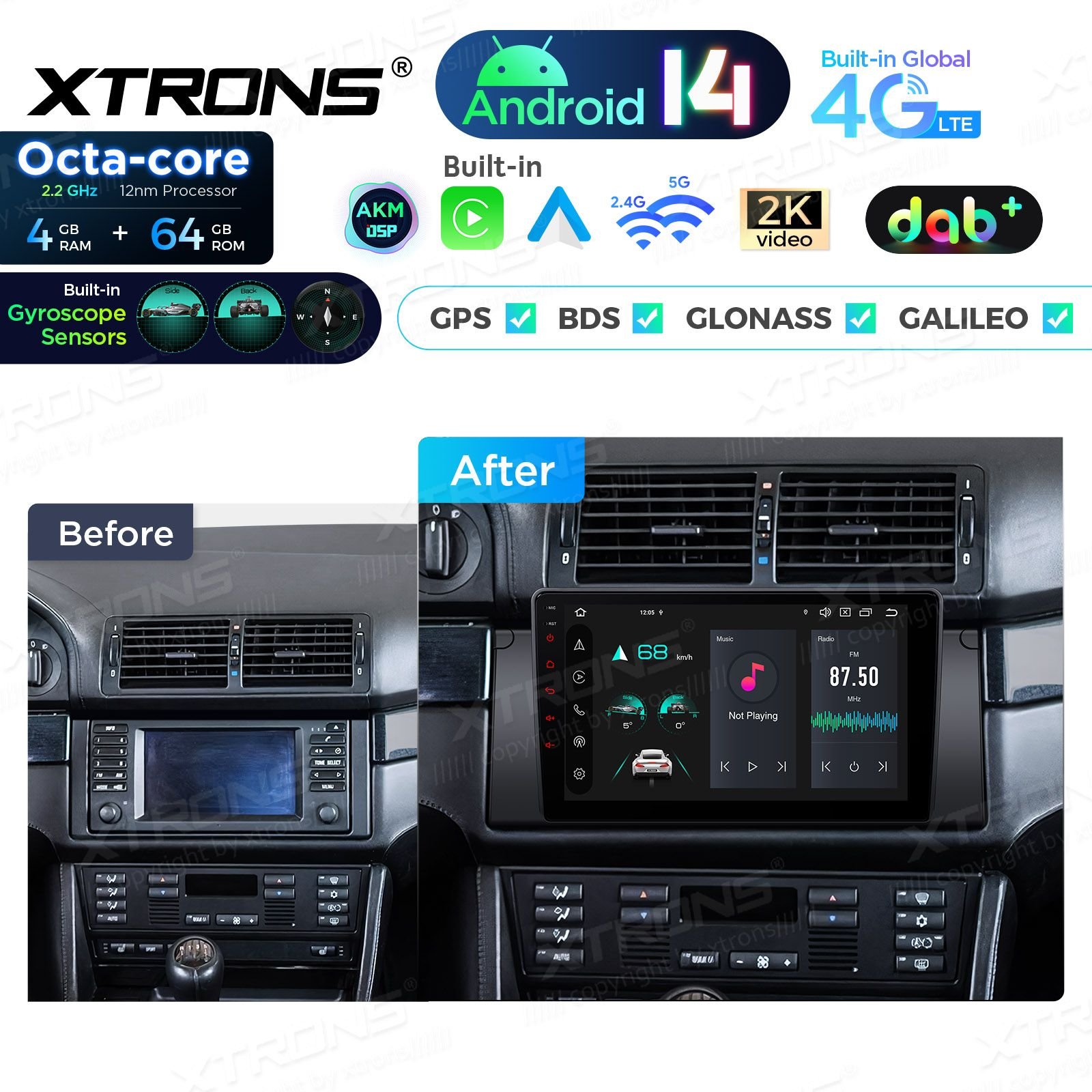 Autorádio pro vozy BMW 5, E39 / E38 - 9" HD dotykový displej IPS, Android 14, osmijádrový procesor, operační paměť 4GB, vnitřní paměť 64GB, DSP, GPS, Wifi, Bluetooth,DAB+, RDS, 4G, USB, slot pro SD kartu, CarPlay, AndroidAuto.