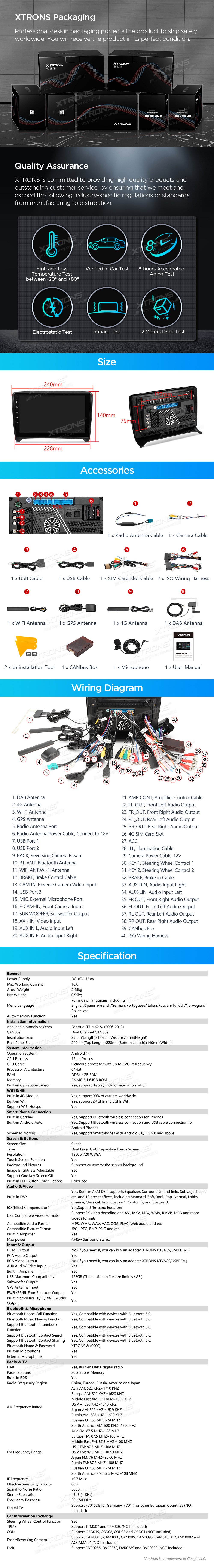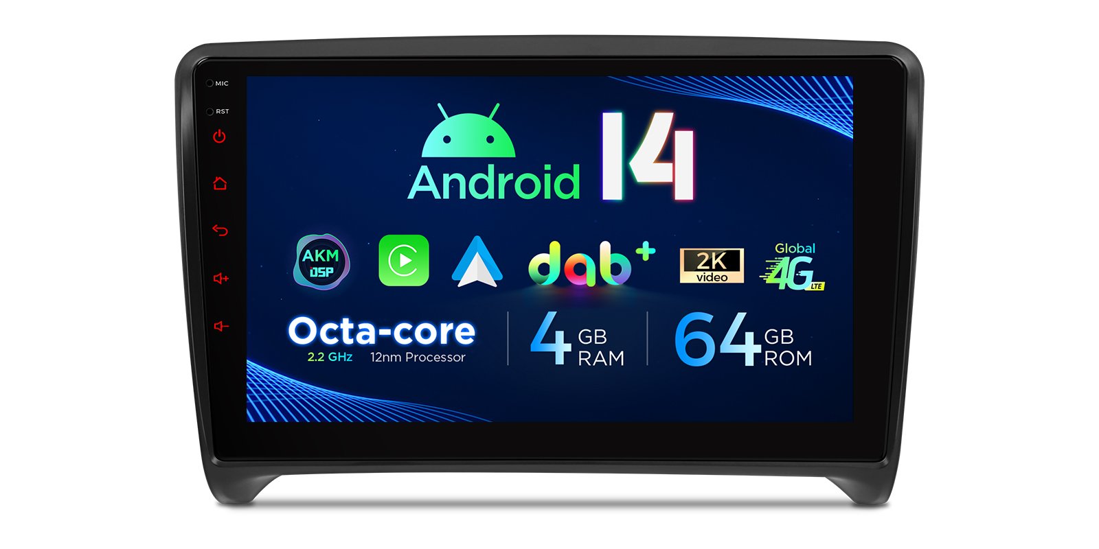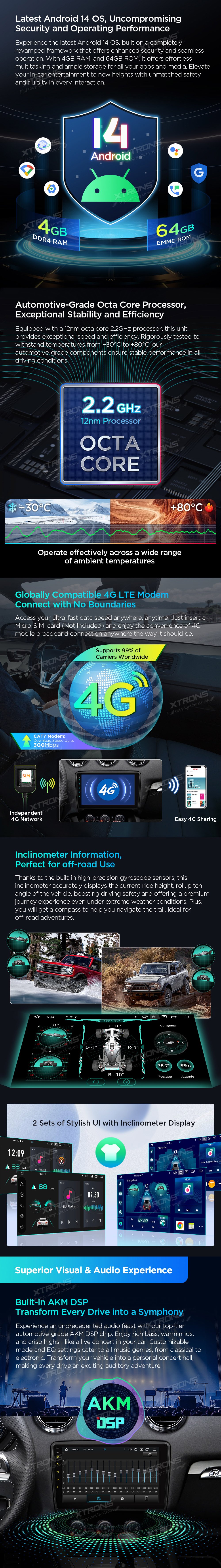 *Android 14 se 4 GB RAM DDR4 + 64 GB ROM EMMC *12nm osmijádrový procesor až 2,2 GHz *9palcový dotykový displej Premium HD IPS G+G s rozlišením 1280*720 * Vestavěné DAB+ *Vestavěné globální 4G LTE *Vestavěné gyroskopické senzory *Vestavěný AKM DSP *Přehrávání videa ve 2K *2 sady stylového uživatelského rozhraní s inklinometrem *Vestavěné bezdrátové CarPlay a plně funkční bezdrátové a kabelové Android Auto *Rychlá a přesná GPS navigace *Okamžitý režim couvání kompatibilní s AHD kamerou *Optimalizované dekódování CANbus -Ovládání na volantu *Dynamická atmosféra s všestrannými vícebarevnými LED světly *Zrcadlení obrazovky *Nejnovější Bluetooth 5.0 *Dvoupásmový WiFi modul (2,4 GHz a 5 GHz) *Sdílení mobilní sítě přes USB tethering *PIP - obraz v obraze *Hardware automobilové třídy -STMicroelectronics Zesilovač TDA7388 - Vestavěné 3 USB vstupy - Rádio STMicroelectronics SI7455 s RDS * Externí mikrofon součástí balení * Efektivní chladicí systém * Prozkoumejte další funkce s příslušenstvím XTRONS (volitelné) - Kamera, OBD, DVR, TPMS, klávesnice a HD/RCA výstup
