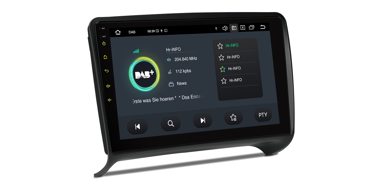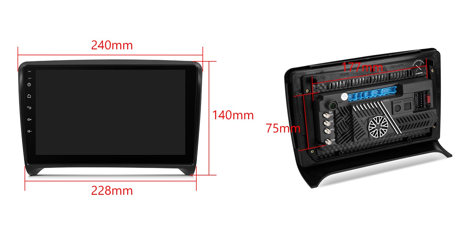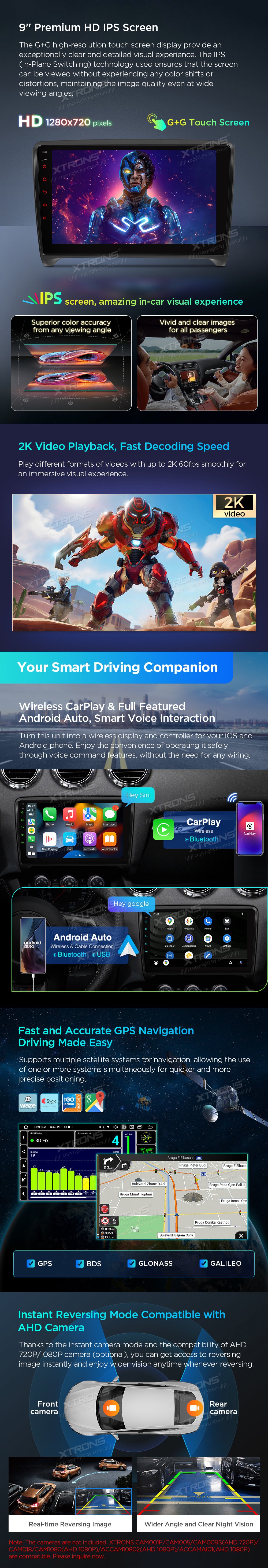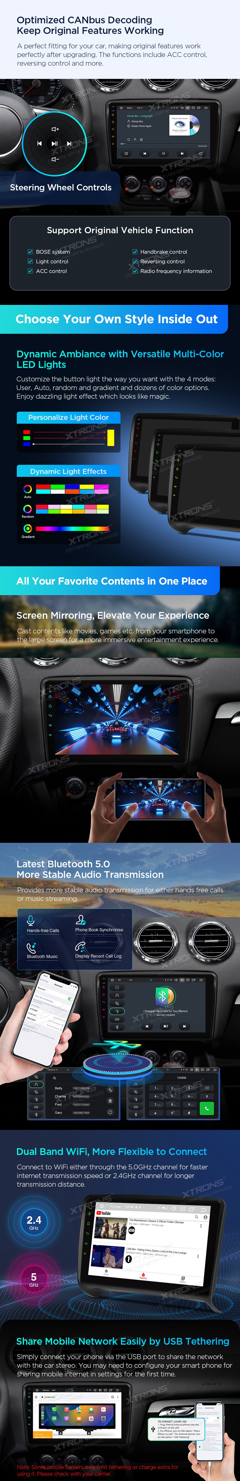 *Android 14 se 4 GB RAM DDR4 + 64 GB ROM EMMC *12nm osmijádrový procesor až 2,2 GHz *9palcový dotykový displej Premium HD IPS G+G s rozlišením 1280*720 * Vestavěné DAB+ *Vestavěné globální 4G LTE *Vestavěné gyroskopické senzory *Vestavěný AKM DSP *Přehrávání videa ve 2K *2 sady stylového uživatelského rozhraní s inklinometrem *Vestavěné bezdrátové CarPlay a plně funkční bezdrátové a kabelové Android Auto *Rychlá a přesná GPS navigace *Okamžitý režim couvání kompatibilní s AHD kamerou *Optimalizované dekódování CANbus -Ovládání na volantu *Dynamická atmosféra s všestrannými vícebarevnými LED světly *Zrcadlení obrazovky *Nejnovější Bluetooth 5.0 *Dvoupásmový WiFi modul (2,4 GHz a 5 GHz) *Sdílení mobilní sítě přes USB tethering *PIP - obraz v obraze *Hardware automobilové třídy -STMicroelectronics Zesilovač TDA7388 - Vestavěné 3 USB vstupy - Rádio STMicroelectronics SI7455 s RDS * Externí mikrofon součástí balení * Efektivní chladicí systém * Prozkoumejte další funkce s příslušenstvím XTRONS (volitelné) - Kamera, OBD, DVR, TPMS, klávesnice a HD/RCA výstup