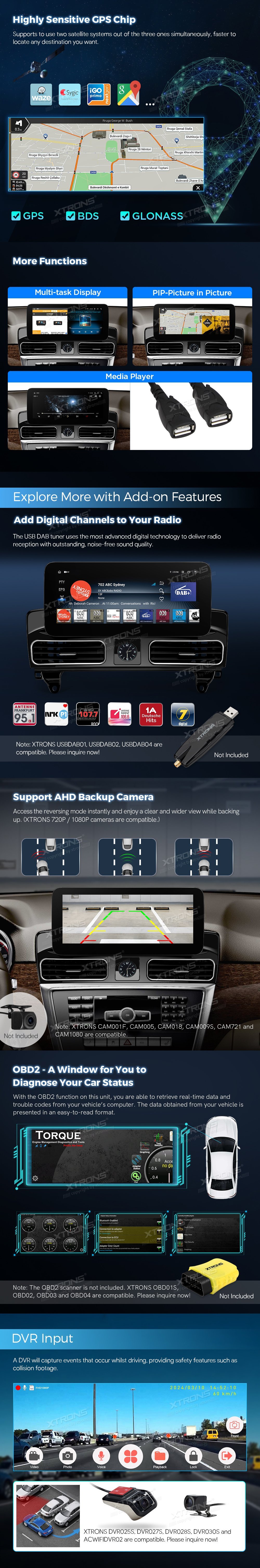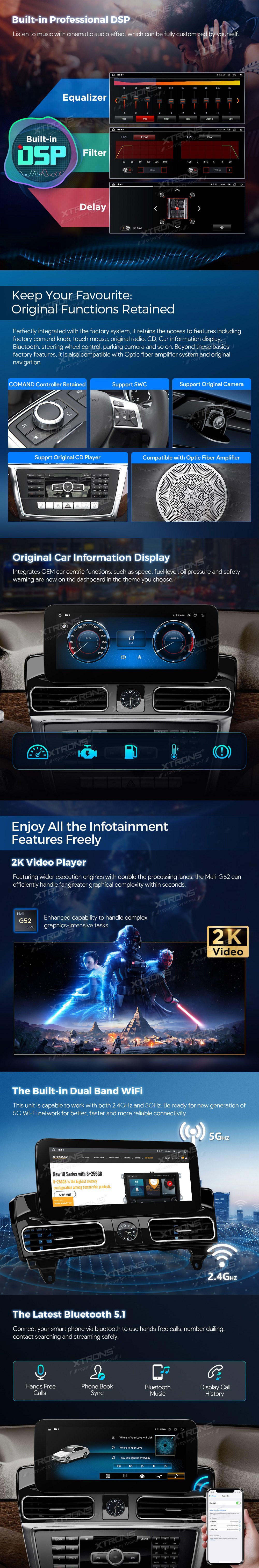 *2K Video přehrávač * Vestavěné bezdrátové CarPlay a bezdrátový a USB kabel Android Auto * Původní funkce zůstaly zachovány -Řadič COMAND -SWC Zachovány -Původní kamera zůstala -Původní CD přehrávač zachován -Optický Vláknový Zesilovač Uchováván *Původní informační displej automobilu * Duální Wi-Fi Band Připojení (2.4GHz & 5GHz) * Nejnovější Bluetooth 5.1 * Vysoce citlivý GPS čip * Multi-task Display *Povolen režim PIP *Mediální přehrávač * Podpora AHD kamery *Volitelné příslušenství pro zdokonalení vašeho uživatelského prostředí - DVR, kamera, OBD, DAB, TPMS, mikrofon, HD / RCA výstup