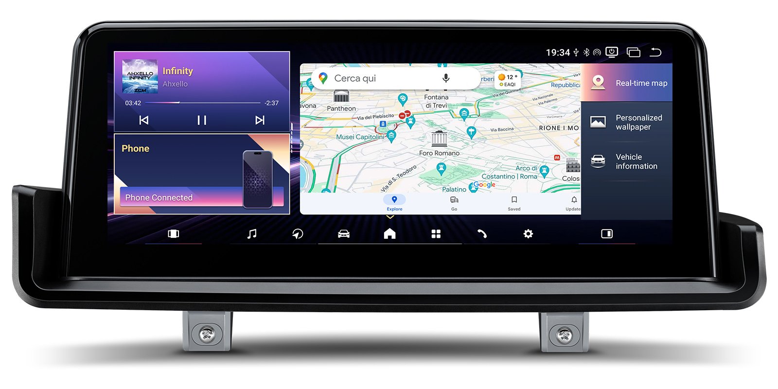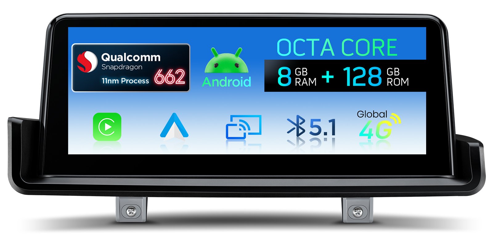 Autorádio pro vozy BMW řady 3 (E90, E91, E92) - 10,25" HD dotykový displej IPS, Android 14, osmijádrový procesor, operační paměť 8GB, vnitřní paměť 128GB, DSP, GPS, Wifi, Bluetooth, RDS, 4G, USB, slot pro SD kartu, CarPlay, Apple play, AndroidAuto.