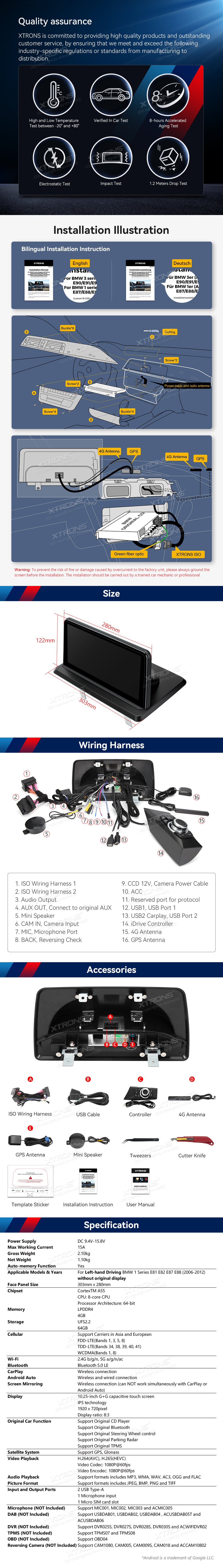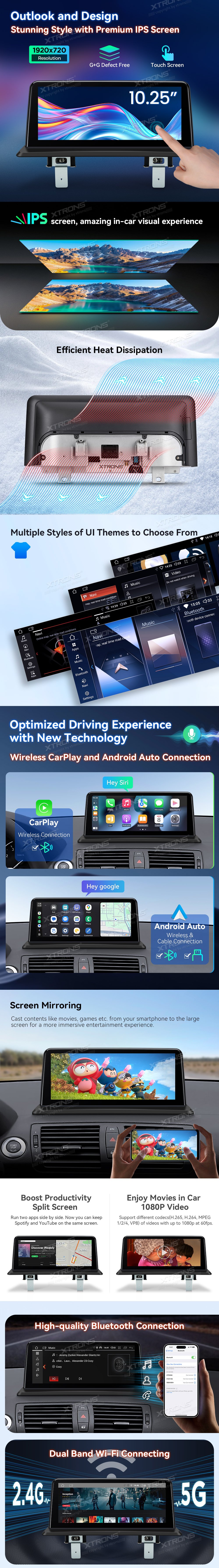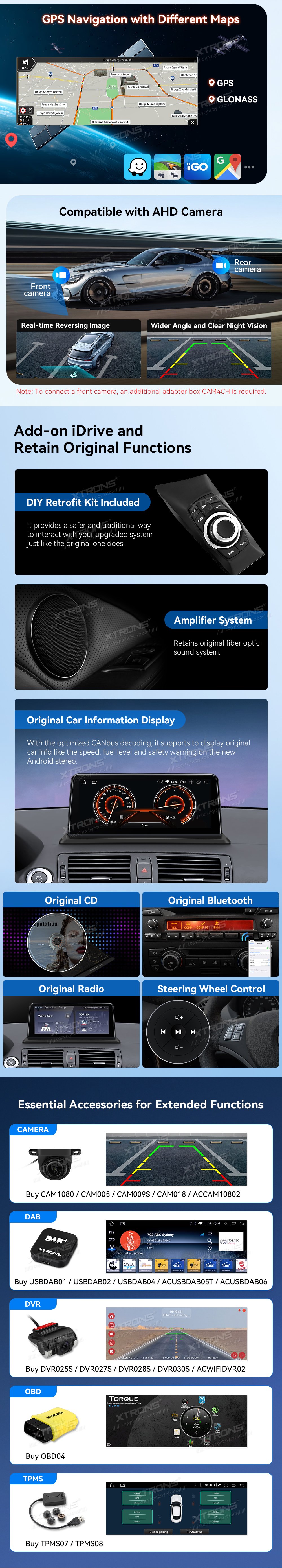 *Podpora 1080P video * Vysoce kvalitní připojení Bluetooth *GPS Navigace *Podpora AHD kamery * Efektní odvod tepla *Přidat iDrive a uchovávat originální funkce -Divná sada Retrofitovaná Sada -Zásobitelský systém -Pravná Displej Ohledně Informací O Voze -Originální rádio a CD přehrávač -Originální Bluetooth - Řízení kol *Rozšířené funkce pro uspokojování vašich potřeb (volitelné) -DAB, DVR, OBD, Fotoaparát, TPMS
