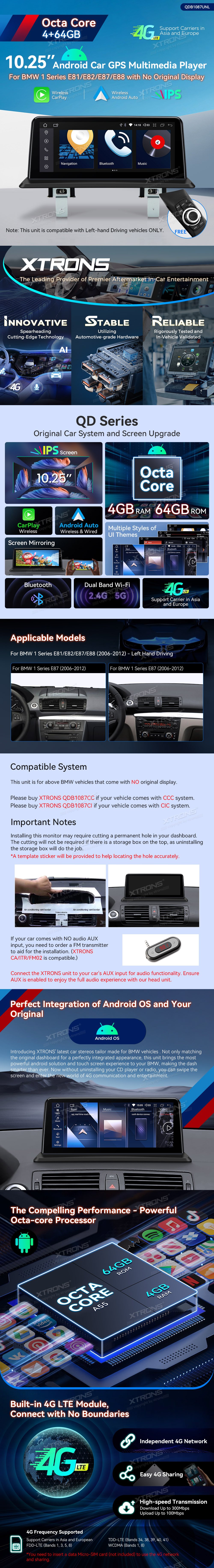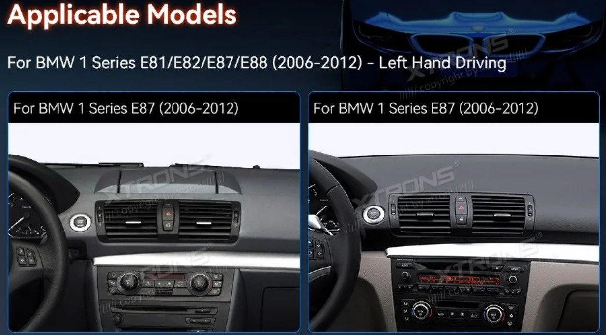 Táto jednotka je určená pre vozidlá BMW 1 Series bez originálneho displeja. Pre vozidlá s iným systémom (napr. CIC alebo NBT) zvoľte iné modely XTRONS.