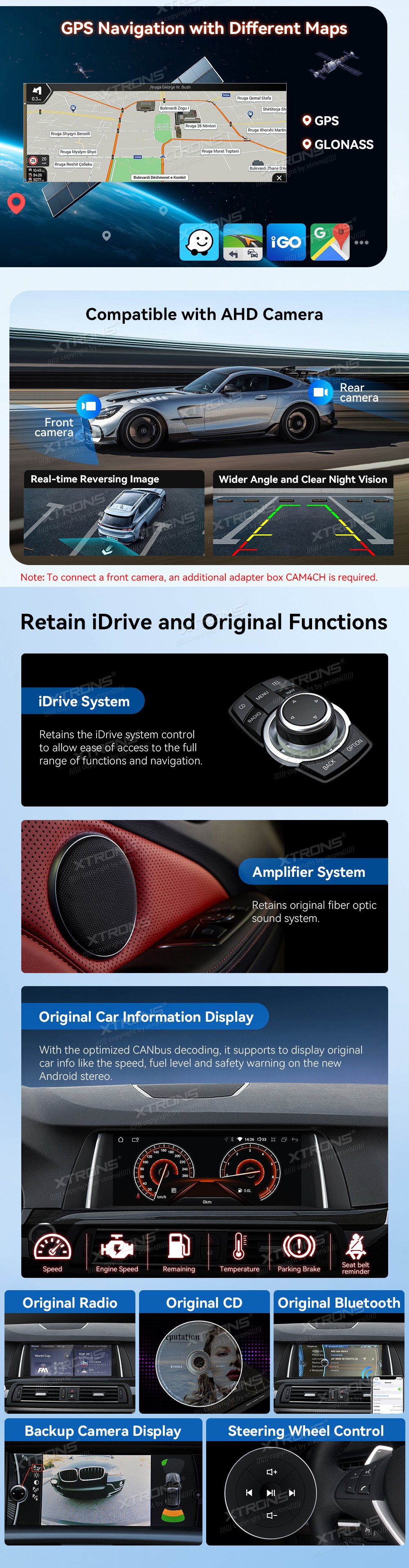 * iDrive systém zostáva funkčný, zachovanie pôvodných funkcií (rádio, CD, zosilňovač, cúvacia kamera) :contentReference[oaicite:3]{index=3}