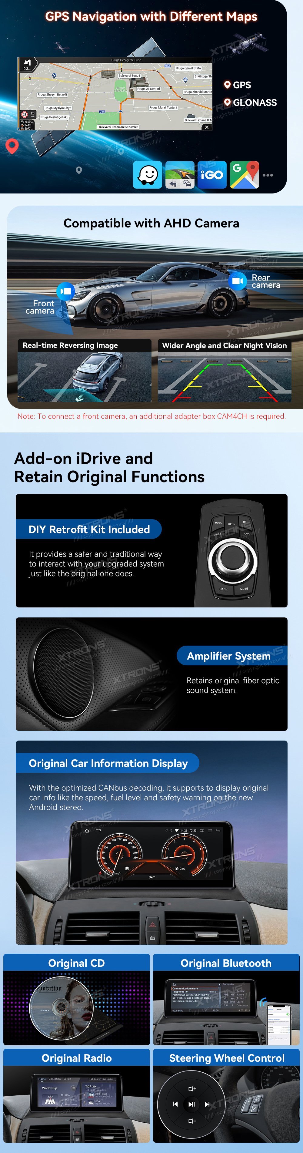 * Originálne funkcie zostávajú zachované: rádio, CD prehrávač, iDrive, originálny displej, Bluetooth, zosilňovač
