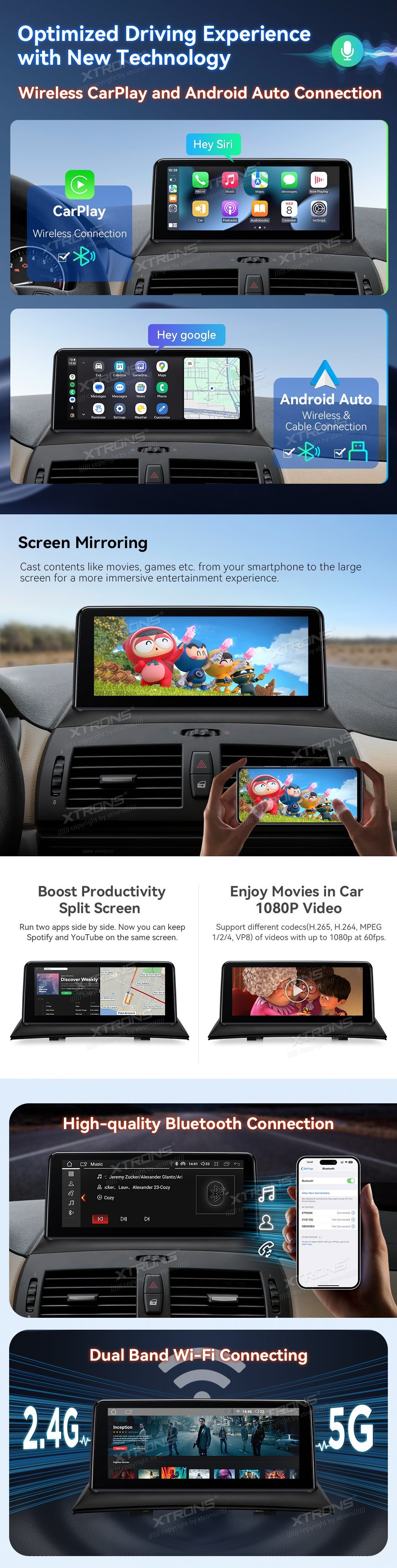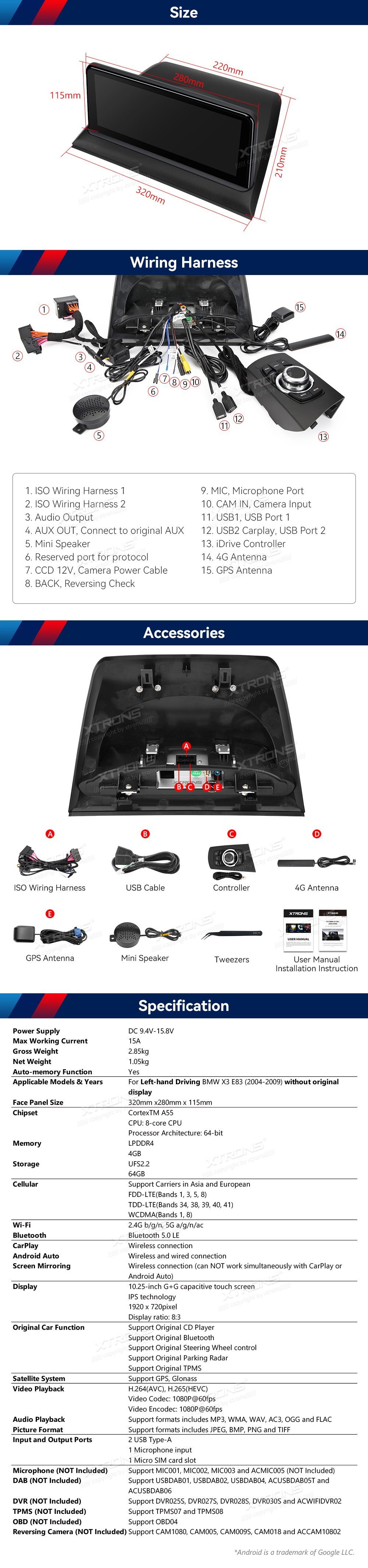 *Perfektní integrace systému Android OS a OEM *Octoa-jádrový 8x Cortex A55 procesor s 4GB RAM + 64GB ROM *Společnost 4G LTE Support Carrier v Asii a Evropě *10.25 palc 1920 * 720 IPS G+G defekt Free Touch Screen *4 sady UI Themites k výběru Z *Built-in Dual Band WiFi (2/4.0.0Ghz) *Postavitelný bezdrátový CarPlay a bezdrátový a USB kabel Android Auto *Screen zrcadlení *Split Screen *Podpora 1080P video * Vysoce kvalitní připojení Bluetooth *GPS Navigace *Podpora AHD kamery *Okaždý přístup k režimu reversing * Efektní odvod tepla *Přidat iDrive a uchovávat originální funkce -Divná sada Retrofitovaná Sada -Zásobitelský systém -Pravná Displej Ohledně Informací O Voze -Originální rádio a CD přehrávač -Originální Bluetooth - Řízení kol *Rozšířené funkce pro uspokojování vašich potřeb (volitelné) -DAB, DVR, OBD, Fotoaparát, TPMS