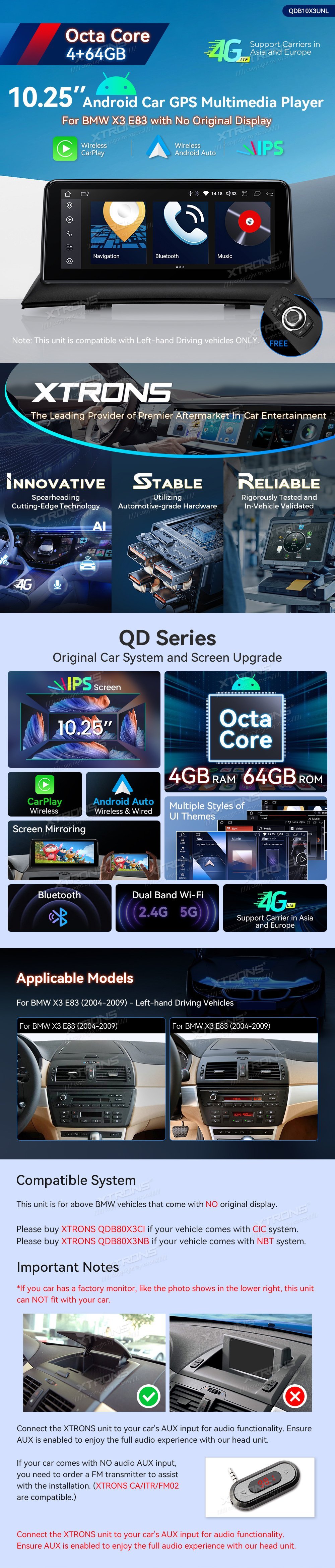 Autorádio pro vozy BMW řady X3 (E83) - 10,25" HD dotykový displej IPS, Android OS, osmijádrový procesor, operační paměť 4GB, vnitřní paměť 64GB, DSP, GPS, Wifi, Bluetooth, RDS, 4G, USB, slot pro SD kartu, CarPlay, AndroidAuto
