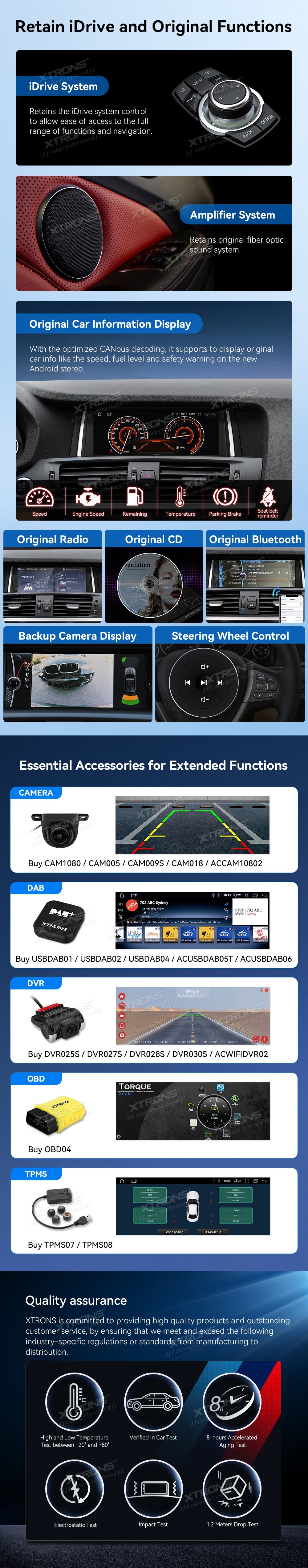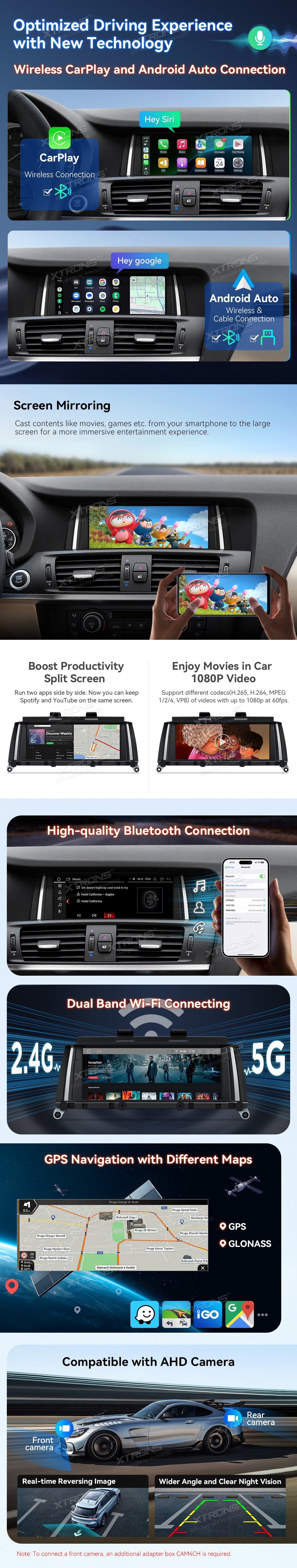 *Perfektní integrace systému Android OS a OEM *Octoa-jádrový 8x Cortex A55 procesor s 4GB RAM + 64GB ROM *Společnost 4G LTE Support Carrier v Asii a Evropě * 8,8 palna 1280x480 IPS G+G defekt Free Touch Screen *4 sady UI Themites k výběru Z *Built-in Dual Band WiFi (2/4.0.0Ghz) *Postavitelný bezdrátový CarPlay a bezdrátový a USB kabel Android Auto *Screen zrcadlení *Split Screen *Podpora 1080P video * Vysoce kvalitní připojení Bluetooth *GPS Navigace *Podpora AHD kamery *Okaždý přístup k režimu reversing * Efektní odvod tepla * Udržujte originální iDrive a jiné funkce -iDrive Systém, Zesilovačový systém -Pravná Displej Ohledně Informací O Voze -Originální rádio a CD přehrávač -Backupní displej kamery, Bluetooth - Funkce řízení kol *Rozšířené funkce pro uspokojování vašich potřeb (volitelné) -DAB, DVR, OBD, Fotoaparát, TPMS