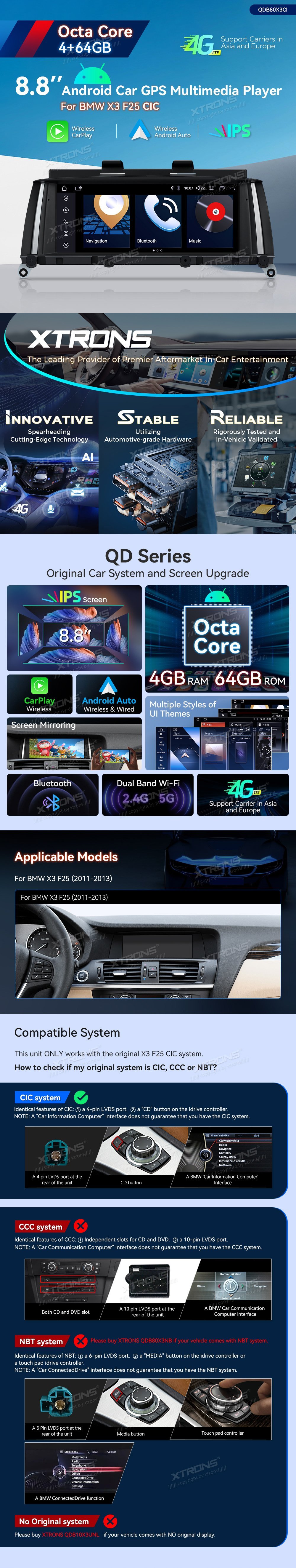 Autorádio pro vozy BMW řady X3 (F25) CIC - 8,8" HD dotykový displej IPS, Android OS, osmijádrový procesor, operační paměť 4GB, vnitřní paměť 64GB, DSP, GPS, Wifi, Bluetooth, RDS, 4G, USB, slot pro SD kartu, CarPlay, AndroidAuto