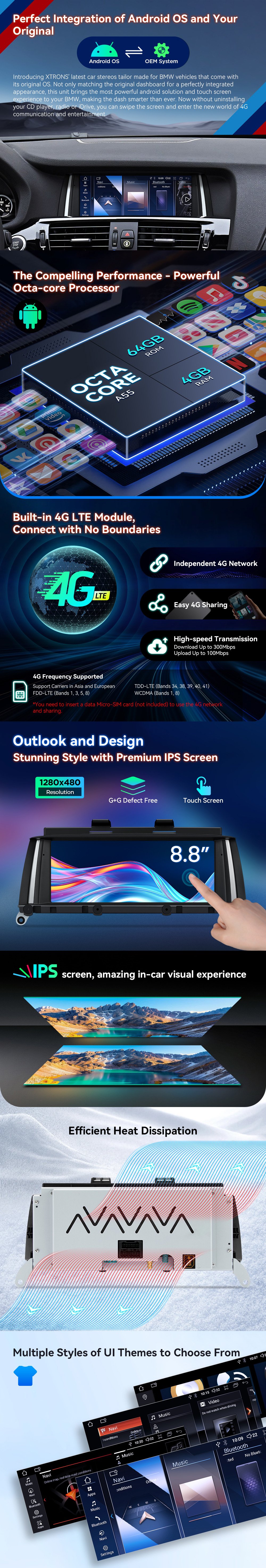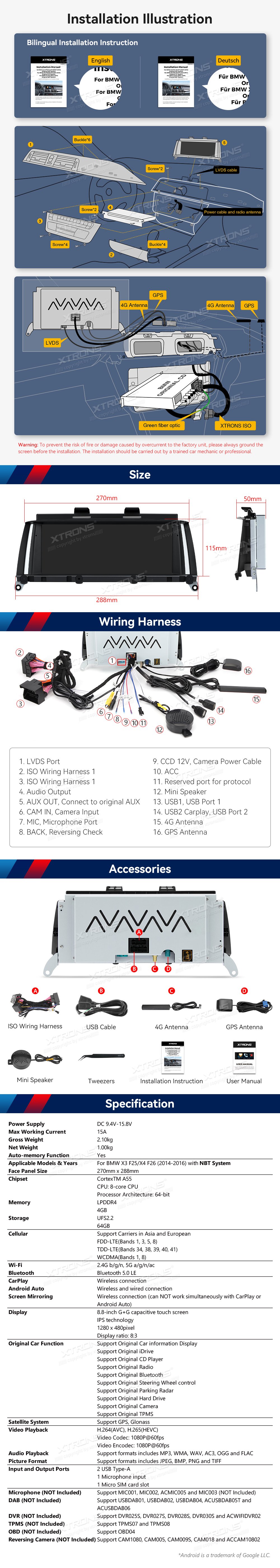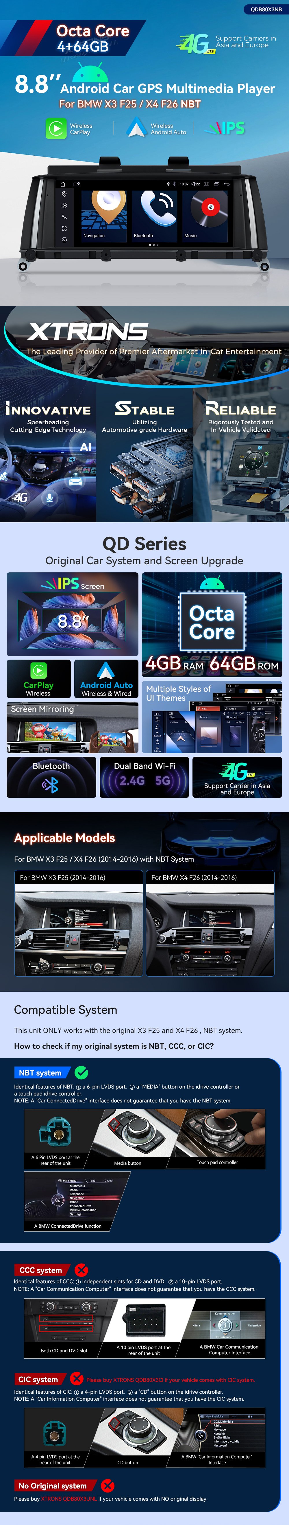 Autorádio pro vozy BMW řady X3 (F25) NBT - 8,8" HD dotykový displej IPS, Android OS, osmijádrový procesor, operační paměť 4GB, vnitřní paměť 64GB, DSP, GPS, Wifi, Bluetooth, RDS, 4G, USB, slot pro SD kartu, CarPlay, AndroidAuto