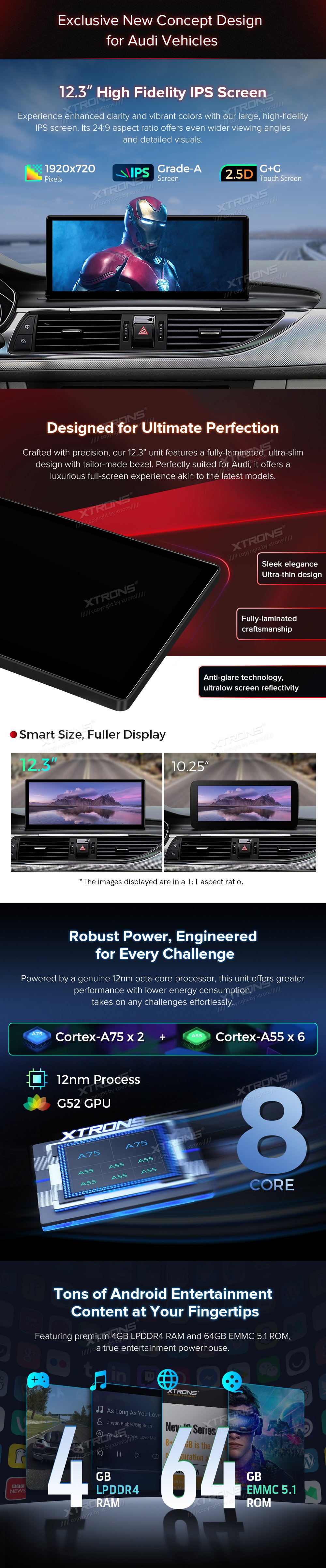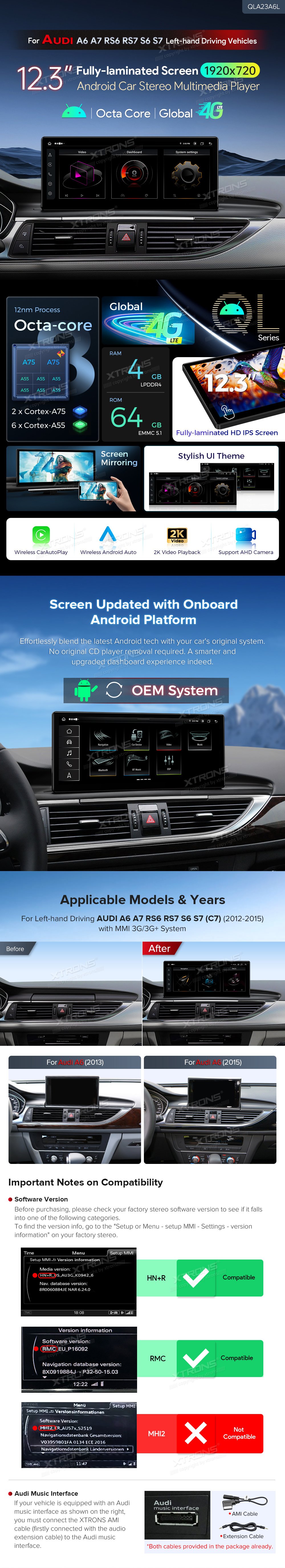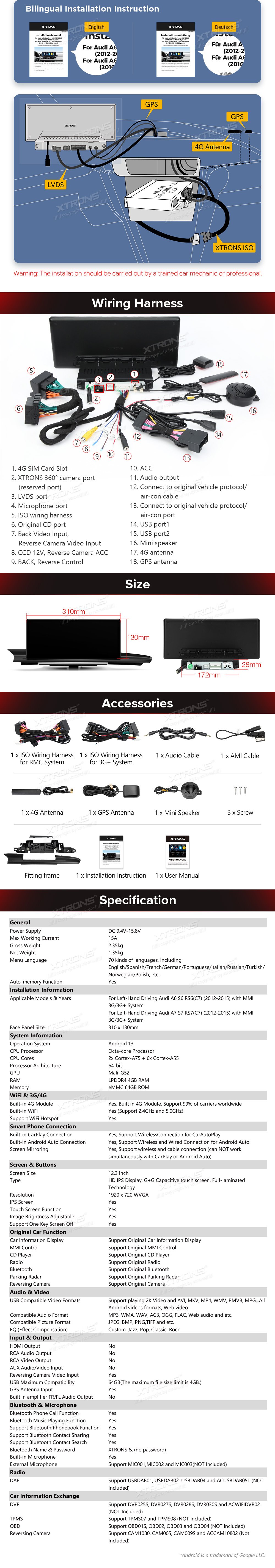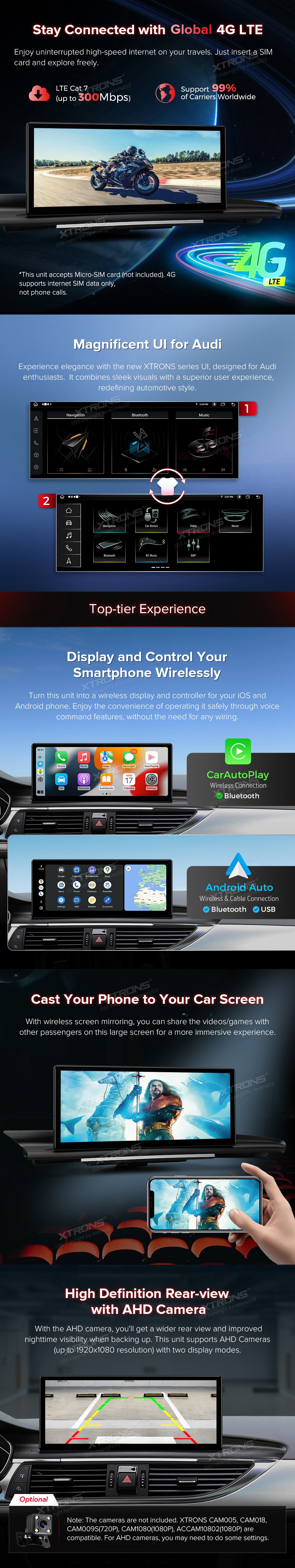 * 12,3 palcový exkluzivní nový koncept pro vozidla Audi *1920 * 720 IPS 2.5D G + G Dotyková obrazovka * Plně laminovaná obrazovka IPS Anti-glare * Android 13 Cortex-A75 x2 + Cortex-A55 x6 12nm Proces *Octa-Core LPDDR4 4GB + 64GB ROM SSD *Globální 4G LTE (Podpora 99 % dopravců po celém světě) * Stylové uživatelské prostředí pro Audi * Built-in bezdrátové CarPlay a bezdrátové a kabelové Android Auto * Zrcadlení obrazovky * Podpora AHD kamery *Anglická a německá uživatelská příručka a návod k instalaci *Původní informační displej automobilu * Původní funkce zůstaly zachovány -Systém zesilovačů -Původní rádio -Původní CD přehrávač -Bluetoothová -Záložní displej fotoaparátu