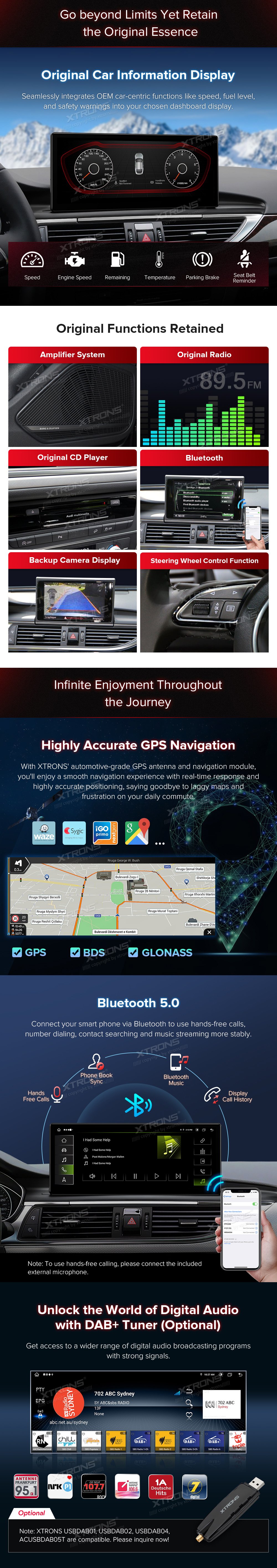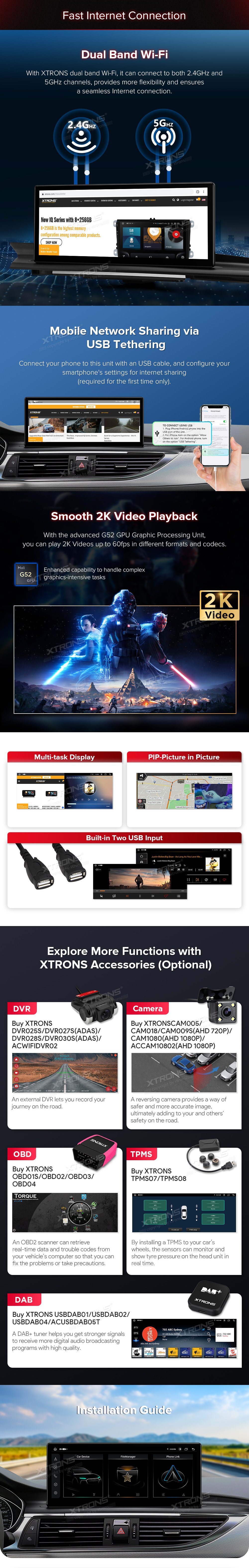 - Funkce ovládání volantu *Přesná GPS navigace *Bluetooth 5.0 * Duální pásmo Wi-Fi (2.4GHz a 5GHz) * Sdílení Mobilních Sítí Prostřednictvím USB Tetheringu * 2K přehrávání videa * Multi-task Display *PIP-Obrázek v obraze * Vestavěný USB vstup * Prozkoumat více funkcí s příslušenstvím XTRONS (volitelné) -DVR, kamera, OBD, TPMS a DAB