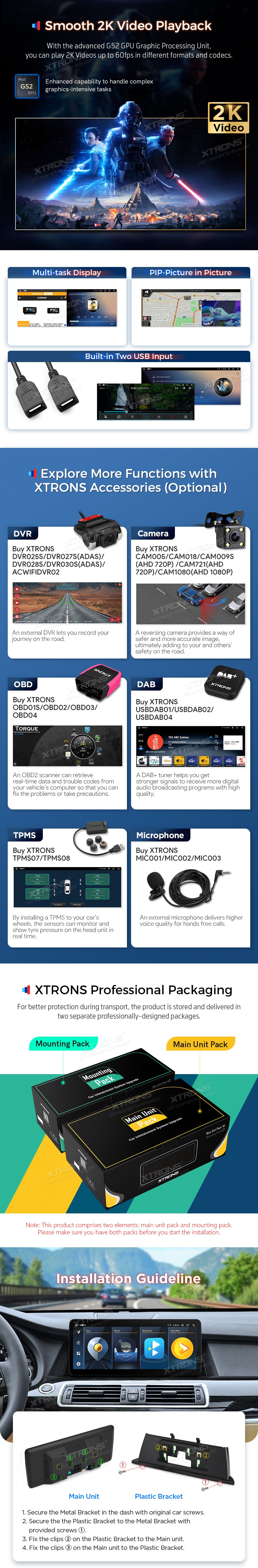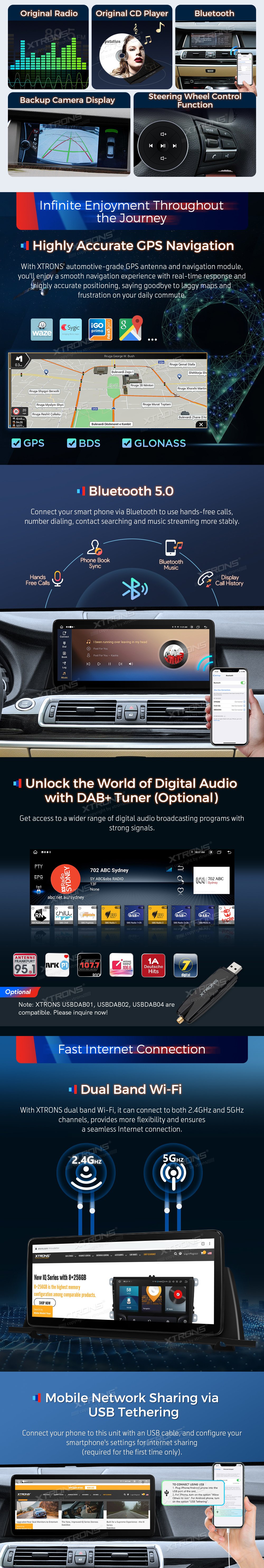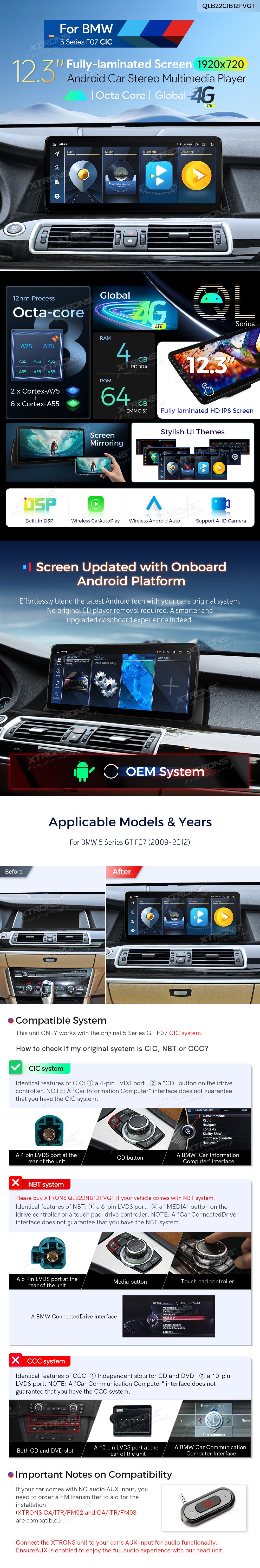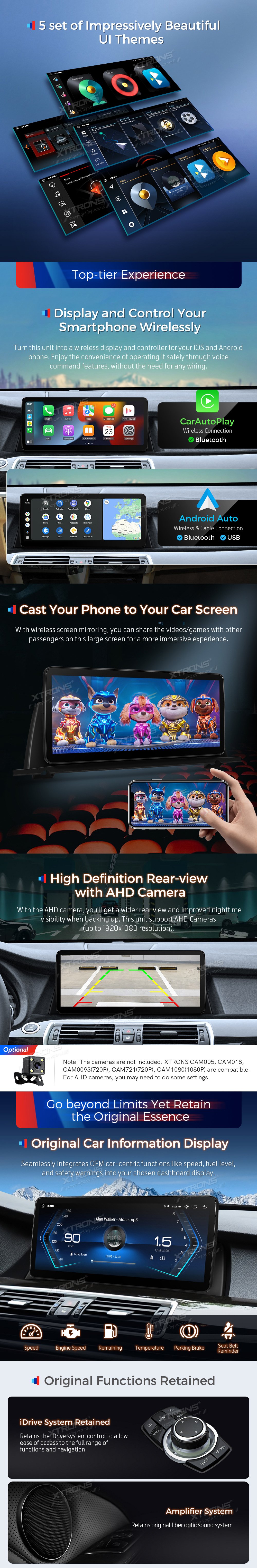 *12,3 palcový exkluzivní nový koncept Ultratenký design * 201920*70 Super Velký IPS 2.5D G+G Stupeň A * Plně Laminovaná anti-Glare Screen *Android 14 Cortex A75 *2+A55*6 12nm Proces *Octa-Core LPDDR4 4GB+64GB ROM SSD *Global 4G LTE (Podpora 99 % dopravců po celém světě) * Stylové uživatelské téma *Wuilt-in Wireless CarPlay a bezdrátový a kabelový Android Auto *Screen zrcadlení *Podpora AHD kamery * Anglický a německý uživatelský manuál a průvodce instalací *Původní zobrazení informací o autech *Originální Funkce Zachovány -iDrive systém zachovaný -Zásobitelský systém -Originální rádio -Pravný CD přehrávač -Bluetooth -Backupní displej fotoaparátu - Funkce řízení kol *Postavitelný DSP *Pravná GPS navigace *Bluetooth 5.0 *Dual Band Wi-Fi (2.4GHz & 5GHz) *Sdílení Mobilní Sítě Přes USB Tethering *2K Video Přehrávání přehrávání * Multitaskový displej *PIP-Obrázek v obraze *Postava 2 USB vstup *Prozkoumejte více funkcí s příslušenstvím XTRONS (volitelné) -DVR, Fotoaparát, OBD, DAB, TPMS a mikrofon