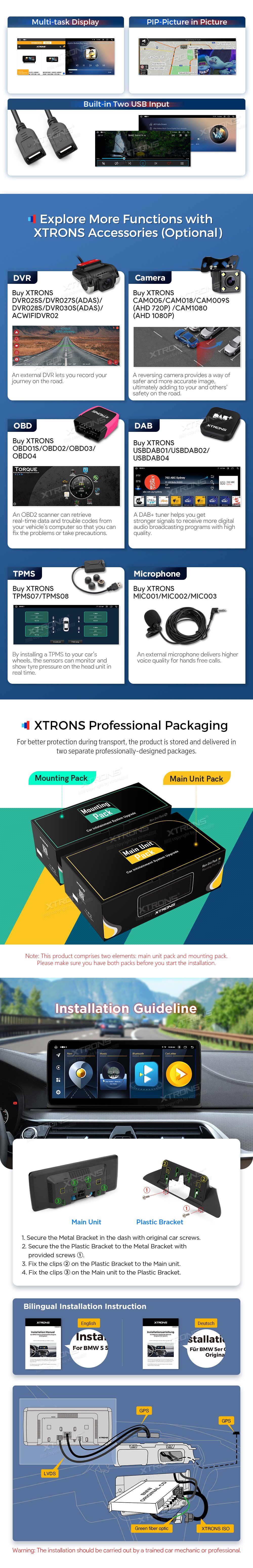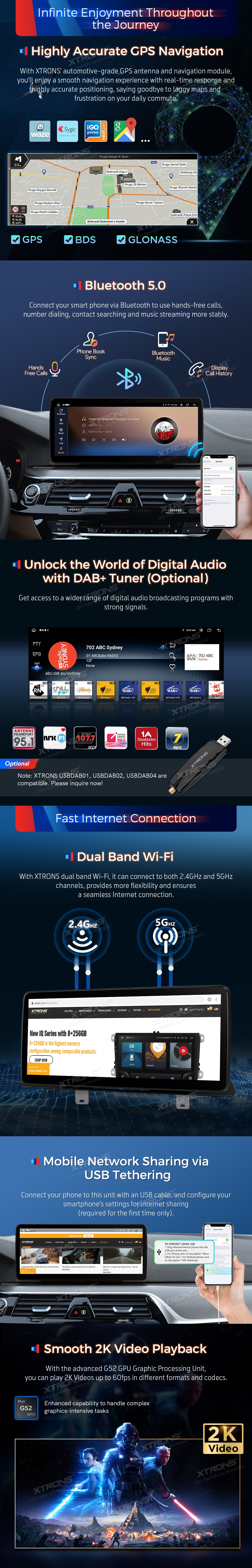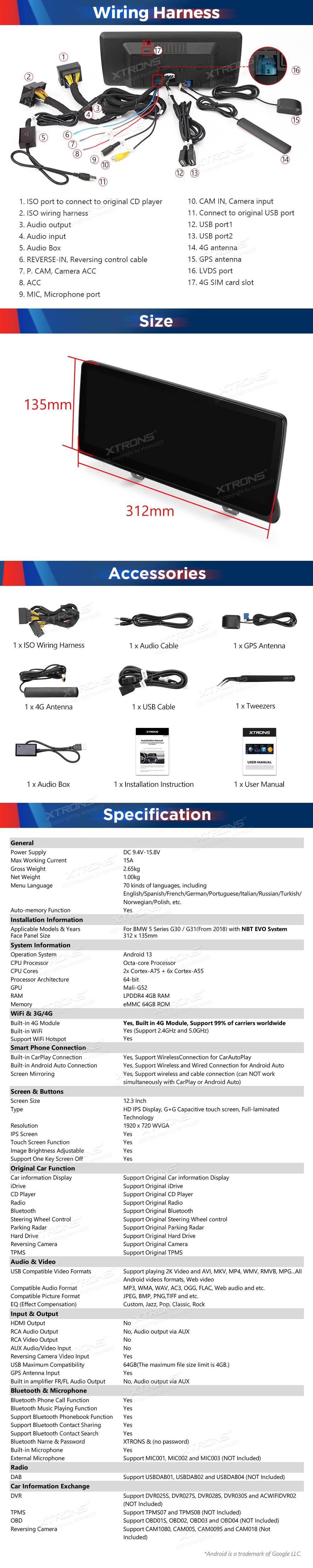 * Android 13, osemjadrový procesor Cortex A75*2 + A55*6, 12nm proces * LPDDR4 4GB RAM + 64GB ROM * 12,3" IPS 1920 x 720 HD dotyková obrazovka * Plne laminovaná antireflexná obrazovka * Bezdrôtový CarPlay a Android Auto * Bluetooth 5.1 * Dual-band Wi-Fi (2.4GHz / 5GHz) * Globálne 4G LTE pripojenie * GPS navigácia * DSP – digitálny zvukový procesor * Podpora AHD cúvacej kamery * Zrkadlenie obrazovky * Možnosť prehrávania 2K videa * Picture-in-Picture režim * Podpora pôvodného ovládania iDrive * Podpora originálnej cúvacej kamery a CD prehrávača * Kompatibilita s optickým zosilňovačom * Podpora doplnkov XTRONS – DVR, OBD2, TPMS, DAB+, externý mikrofón