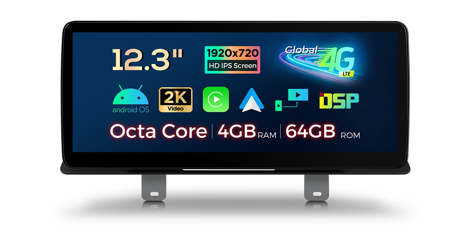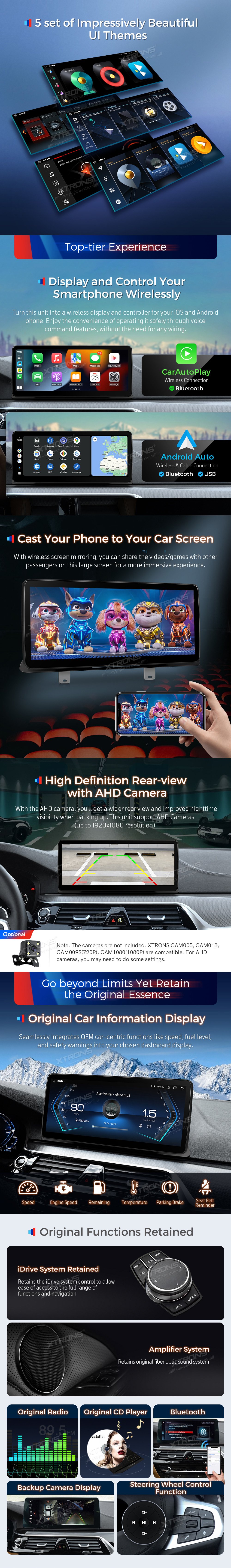 *Android 14 Octa-Core 12nm Proces * DDR4 4GB RAM + 64GB ROM *Nejnovější Bluetooth 5.1 *12,3 palc 1920*720P IPS G+G HD dotykový displej *Úplná Laminovaná obrazovka *Podpora 2K Video *Nové generace 4G připojení *Dual Wi-Fi Band Connection (2.4GHz & 5GHz) *Podpora USB Tethering *Wuilt-in Wireless CarPlay a bezdrátový a kabelový Android Auto *Postavitelný DSP *Originální Funkce Zachovány -iDrive systém zachovaný -Zásobitelský systém -Bluetooth -Podporovat originální rádio -Podporovat originální CD přehrávač -Backupní displej fotoaparátu *4 UI Témata *Podpora AHD zálohovací kamera *Pravná GPS navigace * Multitaskový displej * Povoleno režim PIP *Mediální hráč * AUX na USB audio Out *Volitelné příslušenství pro zdokonalení vašeho uživatelského zážitku - DVR, Fotoaparát, OBD, DAB, TPMS a mikrofon