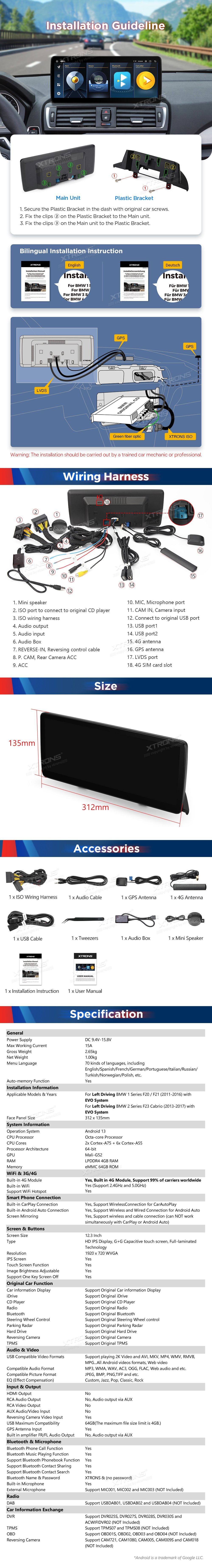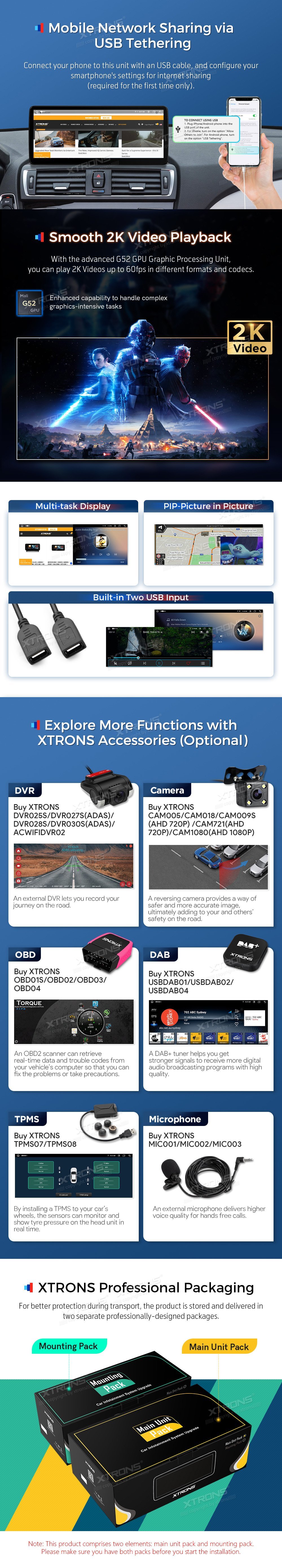 *12,3 palcový exkluzivní nový koncept Ultratenký design * 201920*70 Super Velký IPS 2.5D G+G Stupeň A * Plně Laminovaná anti-Glare Screen *Android 14 Cortex A75 *2+A55*6 12nm Proces *Octa-Core LPDDR4 4GB+64GB ROM SSD *Global 4G LTE (Podpora 99 % dopravců po celém světě) * Stylové uživatelské téma *Wuilt-in Wireless CarPlay a bezdrátový a kabelový Android Auto *Screen zrcadlení *Podpora AHD kamery * Anglický a německý uživatelský manuál a průvodce instalací *Původní zobrazení informací o autech *Originální Funkce Zachovány -iDrive systém zachovaný -Zásobitelský systém -Originální rádio -Pravný CD přehrávač -Bluetooth -Backupní displej fotoaparátu - Funkce řízení kol *Postavitelný DSP *Pravná GPS navigace *Bluetooth 5.0 *Dual Band Wi-Fi (2.4GHz & 5GHz) *Sdílení Mobilní Sítě Přes USB Tethering *2K Video Přehrávání přehrávání * Multitaskový displej *PIP-Obrázek v obraze *Postava 2 USB vstup *Prozkoumejte více funkcí s příslušenstvím XTRONS (volitelné) -DVR, Fotoaparát, OBD, DAB, TPMS a mikrofon