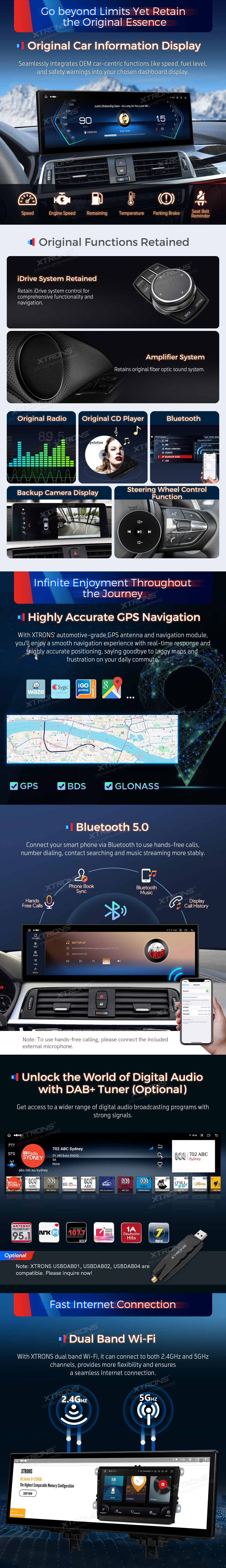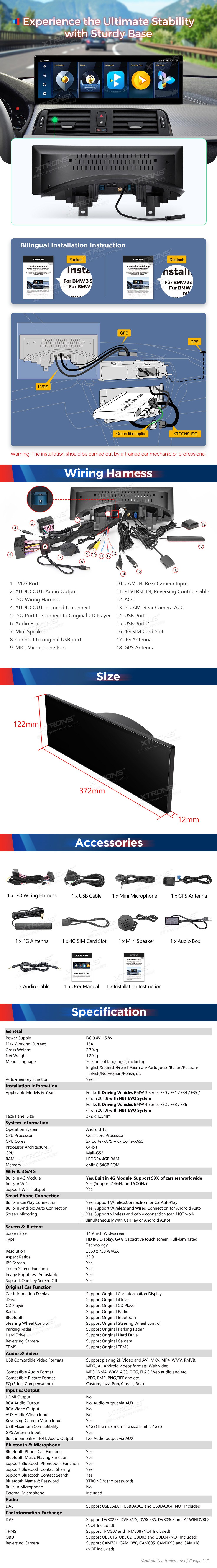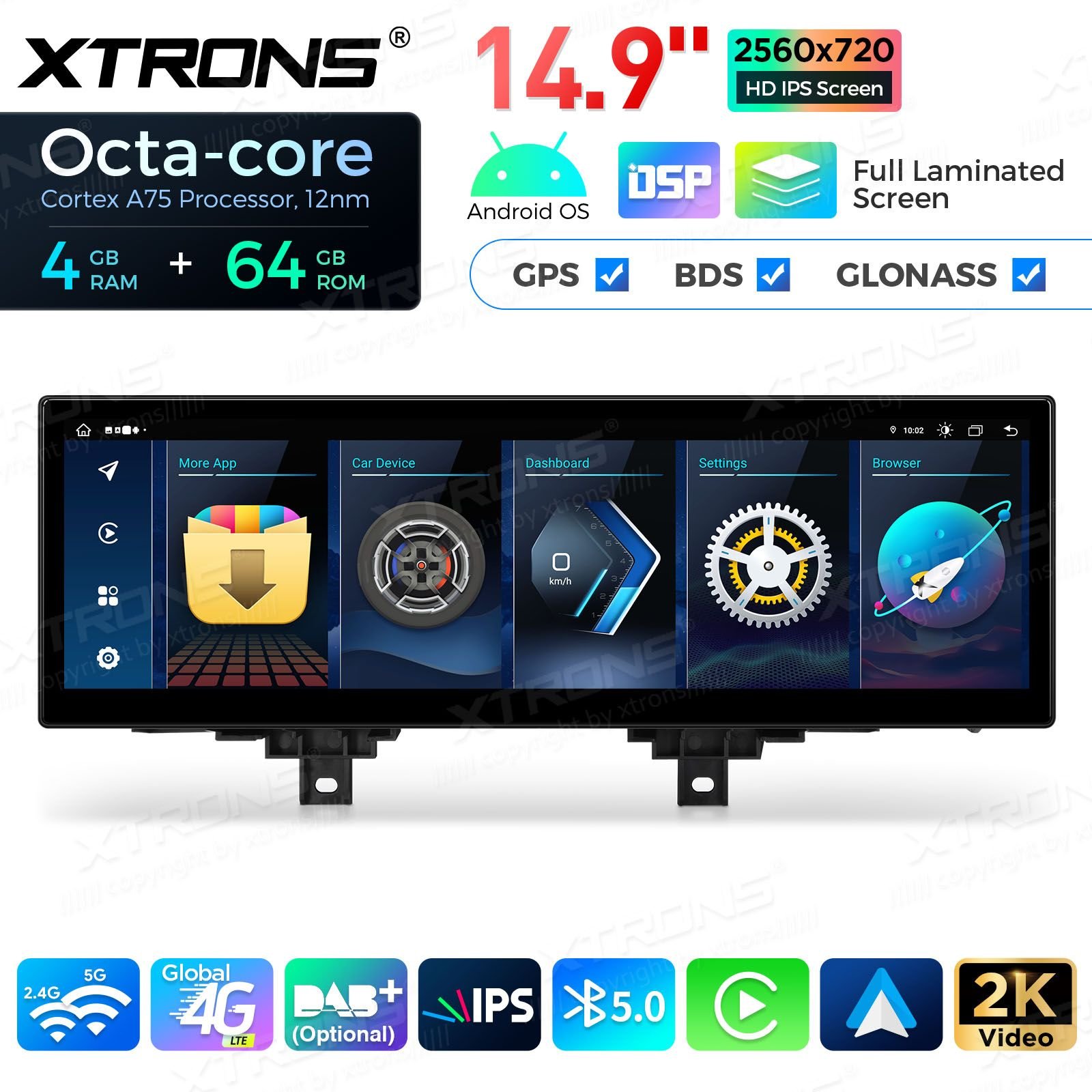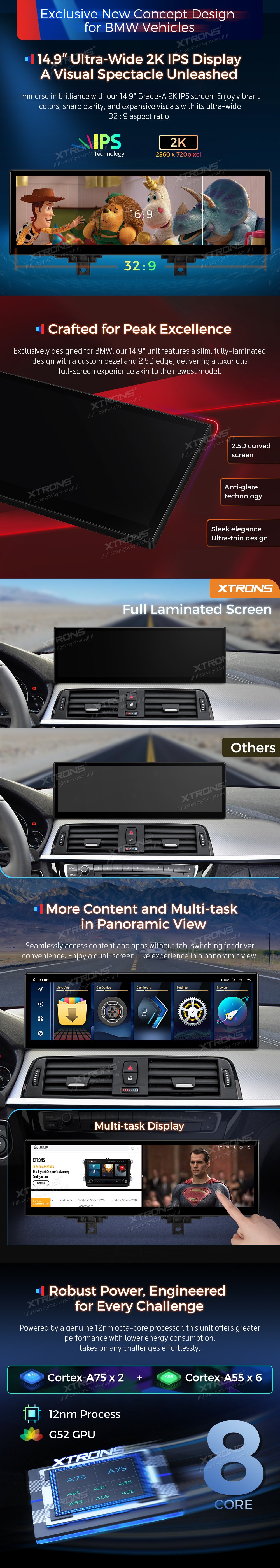 *14,9 palcový exkluzivní nový koncept Ultra-tenký design *2560*720 Super velký IPS 2.5D G+G Grade-A Obrazovka * Plně Laminovaná anti-Glare Screen *Android 14 Cortex A75 *2+A55*6 12nm Proces *Octa-Core LPDDR4 4GB+64GB ROM SSD *Global 4G LTE (Podpora 99 % dopravců po celém světě) * Stylové uživatelské téma *Wuilt-in Wireless CarPlay a bezdrátový a kabelový Android Auto *Screen zrcadlení *Podpora AHD kamery * Anglický a německý uživatelský manuál a průvodce instalací *Původní zobrazení informací o autech *Originální Funkce Zachovány -iDrive systém zachovaný -Zásobitelský systém -Originální rádio -Pravný CD přehrávač -Bluetooth -Backupní displej fotoaparátu - Funkce řízení kol *Postavitelný DSP *Pravná GPS navigace *Bluetooth 5.0 *Dual Band Wi-Fi (2.4GHz & 5GHz) *Sdílení Mobilní Sítě Přes USB Tethering *2K Video Přehrávání přehrávání * Multitaskový displej *PIP-Obrázek v obraze *Postava 2 USB vstup * V ceněn mikrofon *Prozkoumejte více funkcí s příslušenstvím XTRONS (volitelné) -DVR, Fotoaparát, OBD, TPMS a DAB