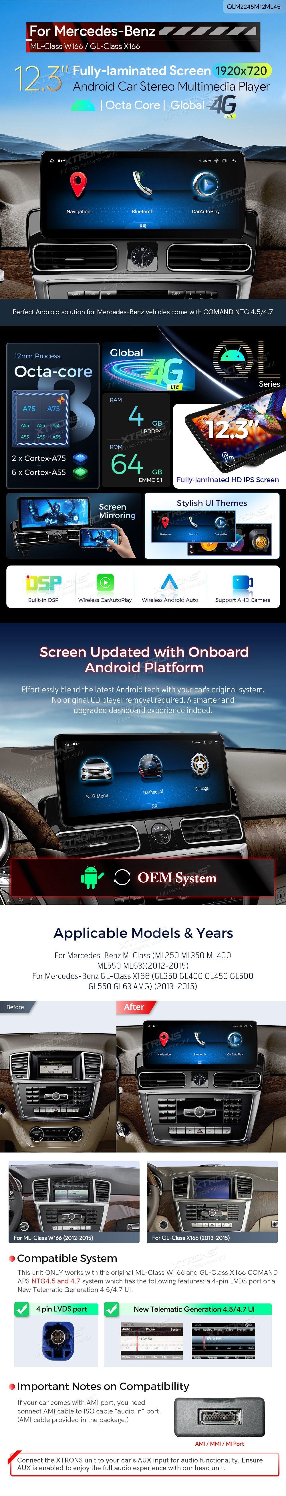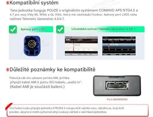 Tato jednotka pracuje POUZE s původním systémem Mercedes-Benz třídy ML W166 a GL třídy X166 COMAND APS NTG 4.5 a NTG 4.7, který má následující vlastnosti: 4-pinový port LVDS nebo nové telematické generace 4.5/4,7 UI.