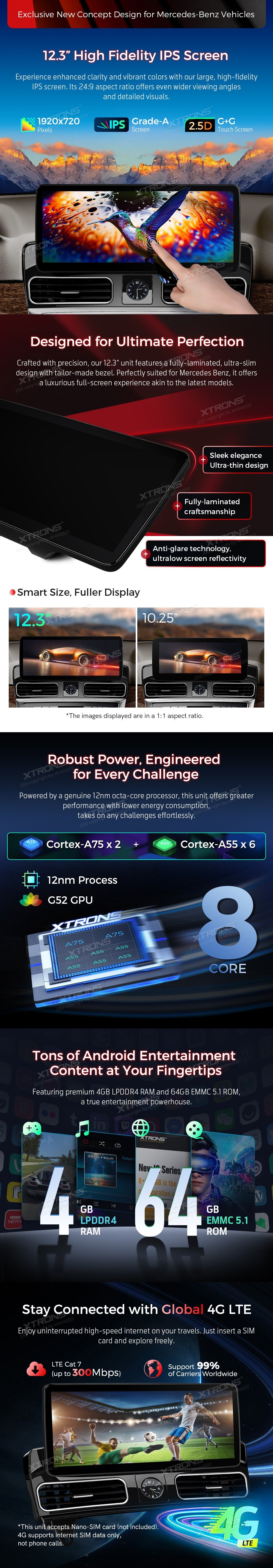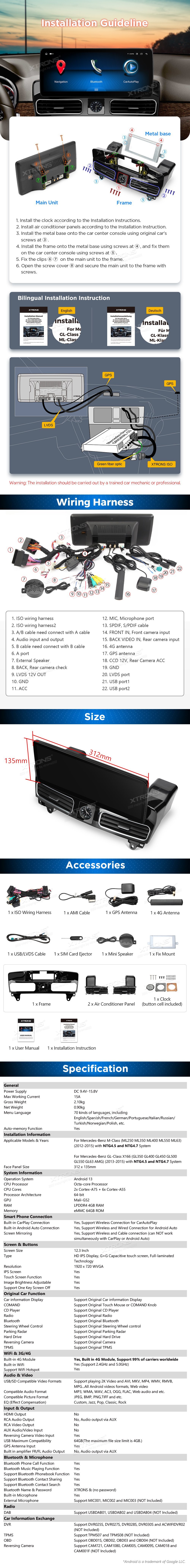 * 12,3 palcový exkluzivní nový koncept ultratenký design * 1920 * 720 Super velký IPS 2.5D G + G Stupeň A obrazovka * Plně laminovaná anti-oslněná obrazovka *Android 14 Cortex A75 * 2 + A55 * 6 12nm Proces *Octa-Core LPDDR4 4GB + 64GB ROM SSD *Globální 4G LTE (Podpora 99 % dopravců po celém světě) * Stylová UI Témata * Built-in bezdrátové CarPlay a bezdrátové a kabelové Android Auto * Zrcadlení obrazovky * Podpora AHD kamery *Anglická a německá uživatelská příručka a návod k instalaci *Původní informační displej automobilu * Původní funkce zůstaly zachovány -Podporovat COMAND Control -Podpořte SWC -Podporovat tovární kameru -Podporovat tovární CD přehrávač -Kompatibilní se zesilovačem optických vláken * Vestavěný DSP