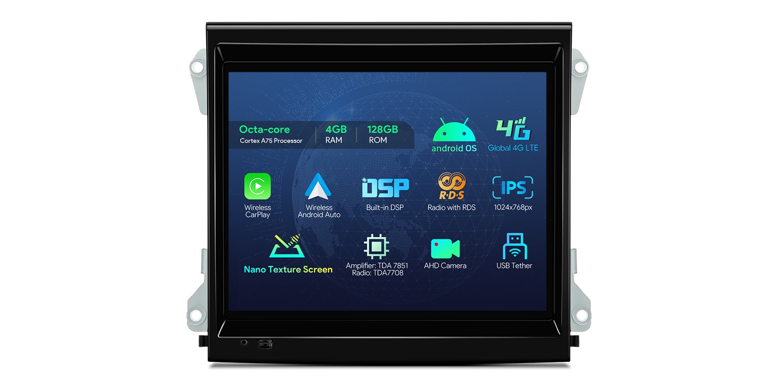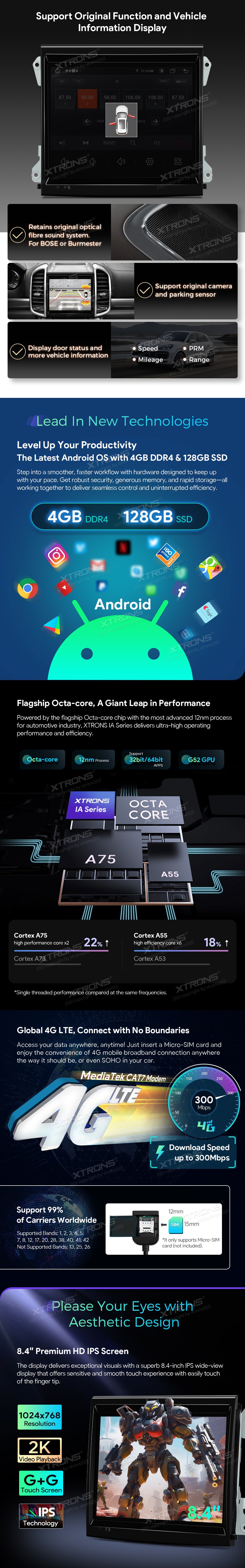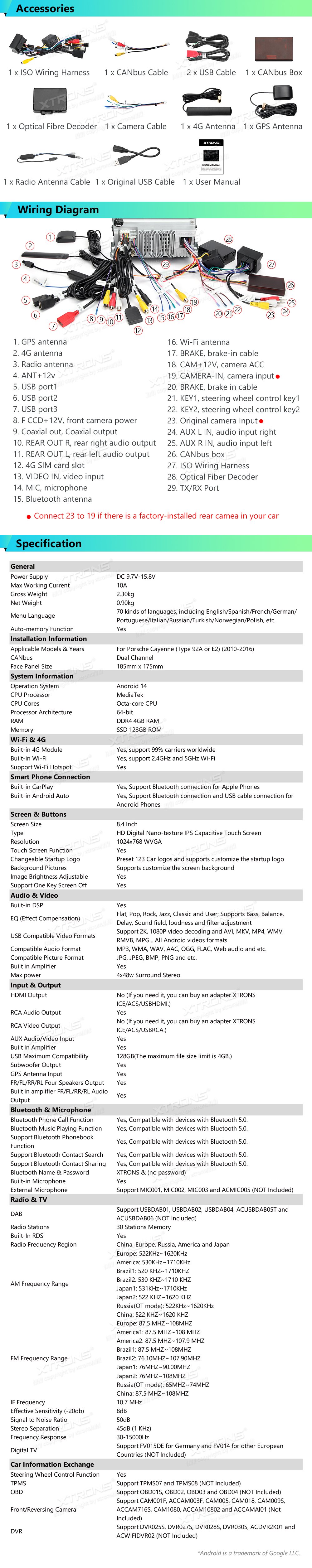 Autorádio pro vozy Porsche Cayenne - 8,4" HD IPS dotykový displej, Android 14, osmijádrový procesor, operační paměť 4GB RAM, vnitřní paměť 128GB ROM, DSP, bezdrátový CarPlay & Android Auto, GPS, Bluetooth 5.0, USB