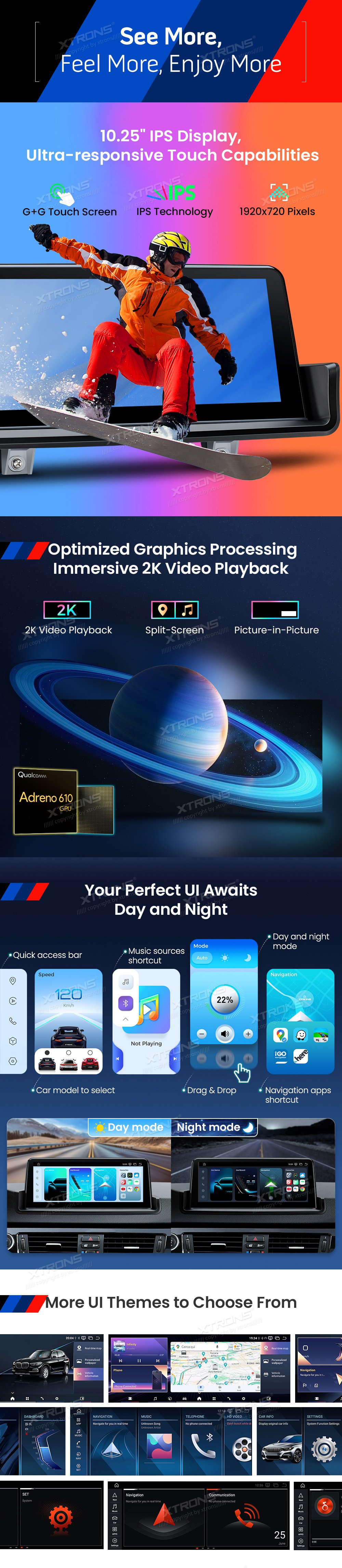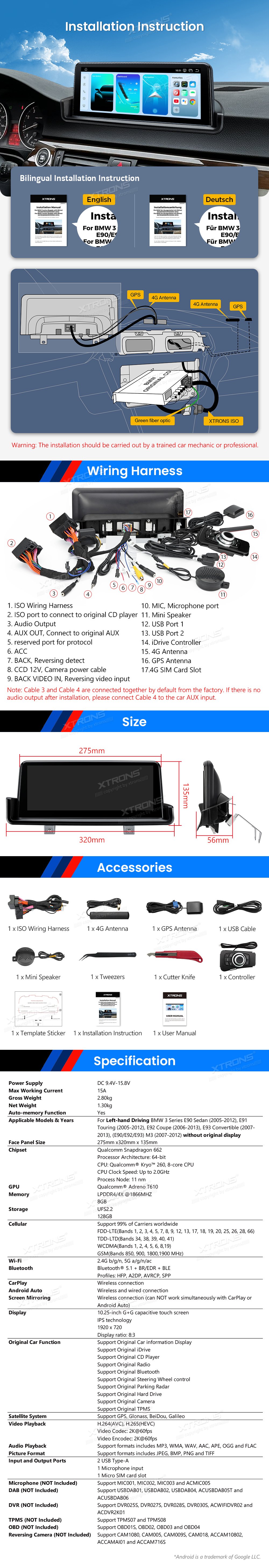 * Perfektně integrace operačního systému Android a vašeho původního systému * Výjimečný Výkon Zpracování, Další Úroveň In-Vehicle Zkušenosti - 11nm procesní technologie - Architektura Kryo 260 - 64 bit Architektura - Motor AI třetí generace * Uvolněte napájení s robustní pamětí a úložištěm (8GB + 112GB) * 10,25" IPS displej, ultra-responzivní dotykové možnosti - G + G Dotyková obrazovka a technologie IPS a 1920x720 pixelů * Optimalizované zpracování grafiky, pohlcující 2K přehrávání videa - Split-Screen & Picture-in-Picture * Inteligentní uživatelské rozhraní s denními a nočními režimy * Více motivů uživatelského rozhraní * Pokročilé CarPlay a Android Auto s inteligentním hlasovým ovládáním * Sdílet Obrazovku Telefonu Bezdrátově * Nejnovější Bluetooth 5.1 s Hi-Fi Audio přenosem * Integrovaná 4G LTE, Globální síťová kompatibilita * Dual-Band Wi-Fi, Rychlé a stabilní připojení * Původní funkce zachovány - ovládání iDrive - Tovární zesilovač - Originální CD přehrávač a rádio - Tovární Bluetooth - Zálohovací displej fotoaparátu - Podpora Ovládání volantu * Přesná navigační podpora ze všech čtyř satelitních systémů * Okamžitý přístup k obráceným obrázkům * Podpora přední a zadní AHD kamery * Základní příslušenství pro rozšířené funkce, včetně fotoaparátu, DAB, DVR, OBD, TPMS