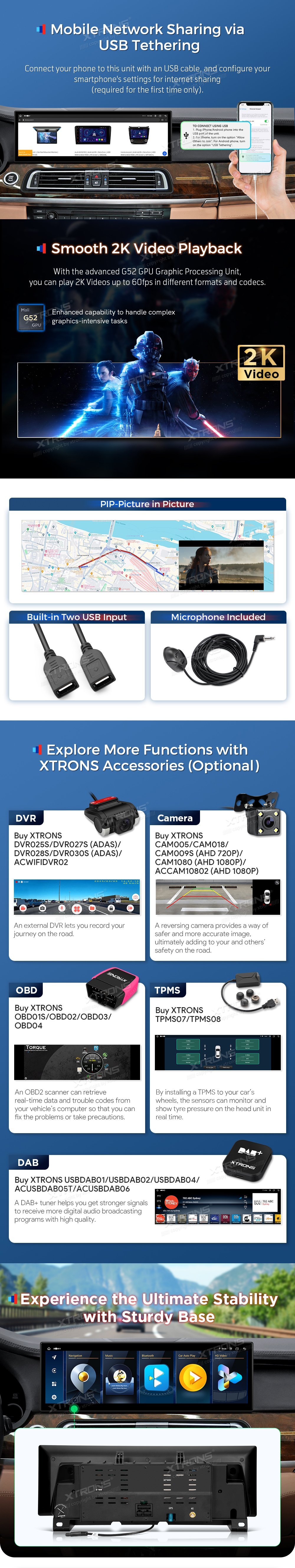 * Platí pro BMW řady 7 F01/F02 (2013-2015) Systém NBT Levotočivá vozidla *14,9'' Ultra-Wide 32:9 Poměr Stupeň A 2K IPS 2560 * 720 Dotyková obrazovka * Plně laminovaná 2,5D G + G obrazovka * Technologie proti oslnění a ultratenký design * 12nm 8 osmijádrový procesor A75 * 2 + A55 * 6 * Android 14 s 8GB RAM (LPDR4), 256GB ROM (EMMC 5.1) * Vestavěná globální síť 4G LTE *Podpořte 360° Fotoaparát * Stylové UI Téma *Podporuje bezdrátové CarPlay a bezdrátové Android Auto * Zrcadlení obrazovky * Podpora 1920x1080P AHD kamery a couvací radar * Podpora originálního informačního displeje a funkcí automobilu *Přesná GPS navigace * Podpora Bluetooth 5.0 * Duální kapela Wifi 2.4GHz a 5GHz * Podpora USB Tethering * G52 GPU Podpora 2K přehrávání videa *Obrázek v obraze * Vestavěný dvouUSB vstup * Mikrofon V Ceně *Volitelné funkce (potřebné příslušenství) -Fotoaparát, OBD, DAB, DVR, TPMS