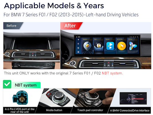 1. Tato jednotka funguje POUZE s originálním systémem BMW NBT. Autorádio se systémem NBT je obvykle vybaveno 6pinovým portem LVDS, tlačítkem "MEDIA" na ovladači iDrive nebo dotykovým panelem ovladače iDrive, rozhraním BMW ConnectedDrive.